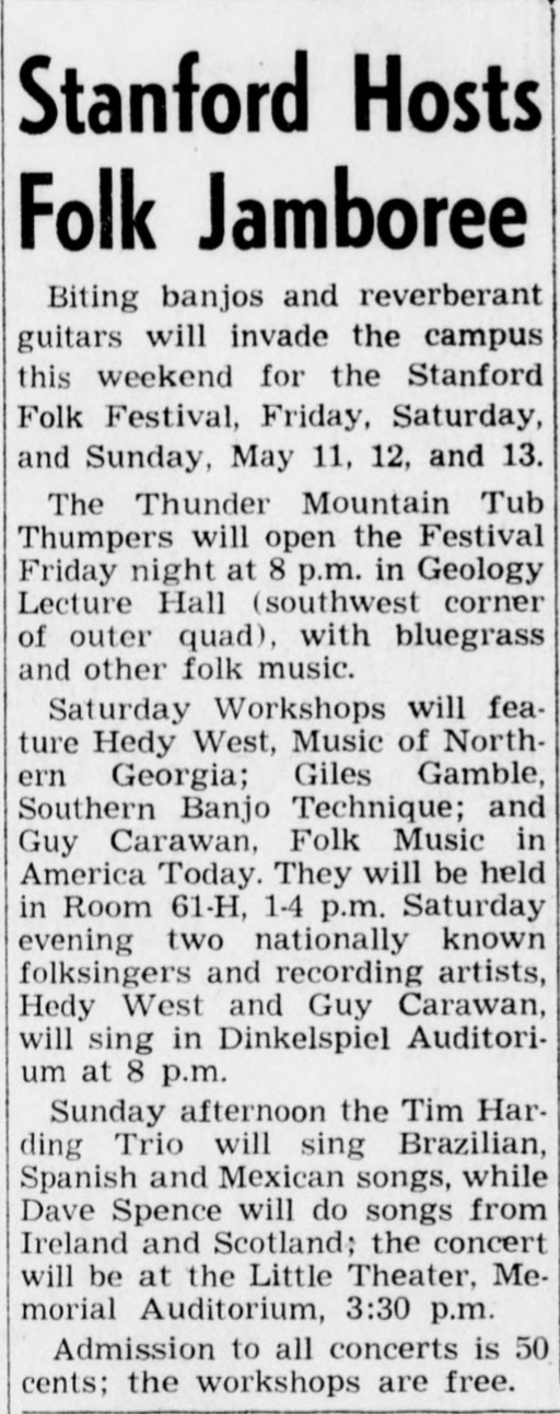 Headliner was Guy Carawan. Hedy West became ill and dropped out. Tub Thumpers took her place.