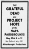 deadlists: has a quote from the promotor "There was a show on May 29, 1967 at the Napa Fairgrounds in Napa, CA, in a building now called Chardonnay Hall.