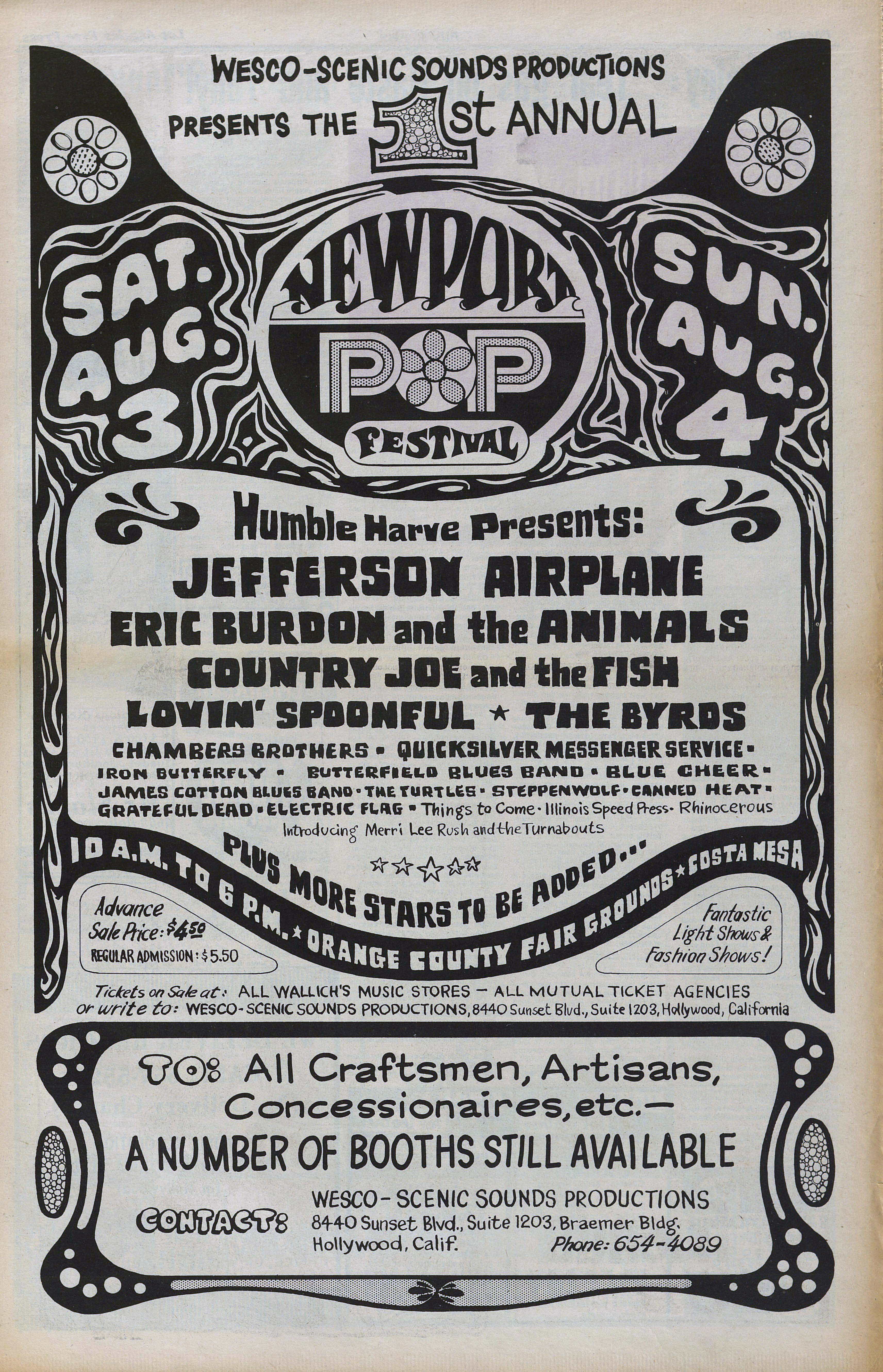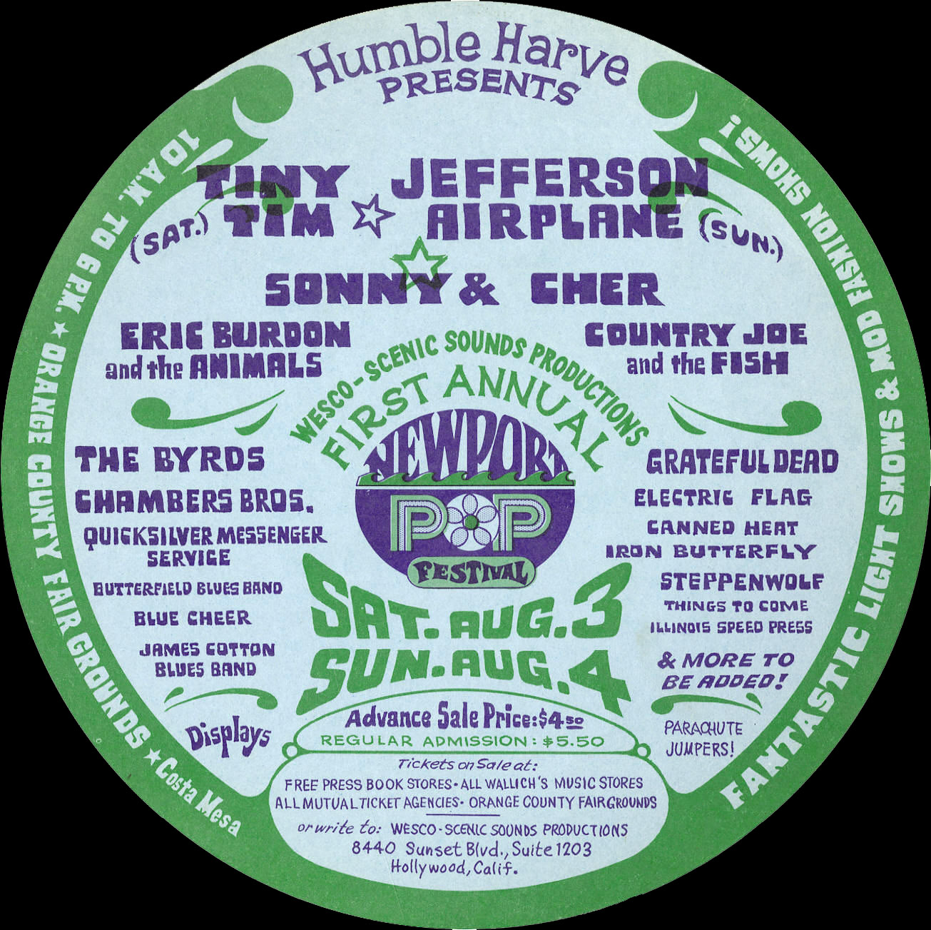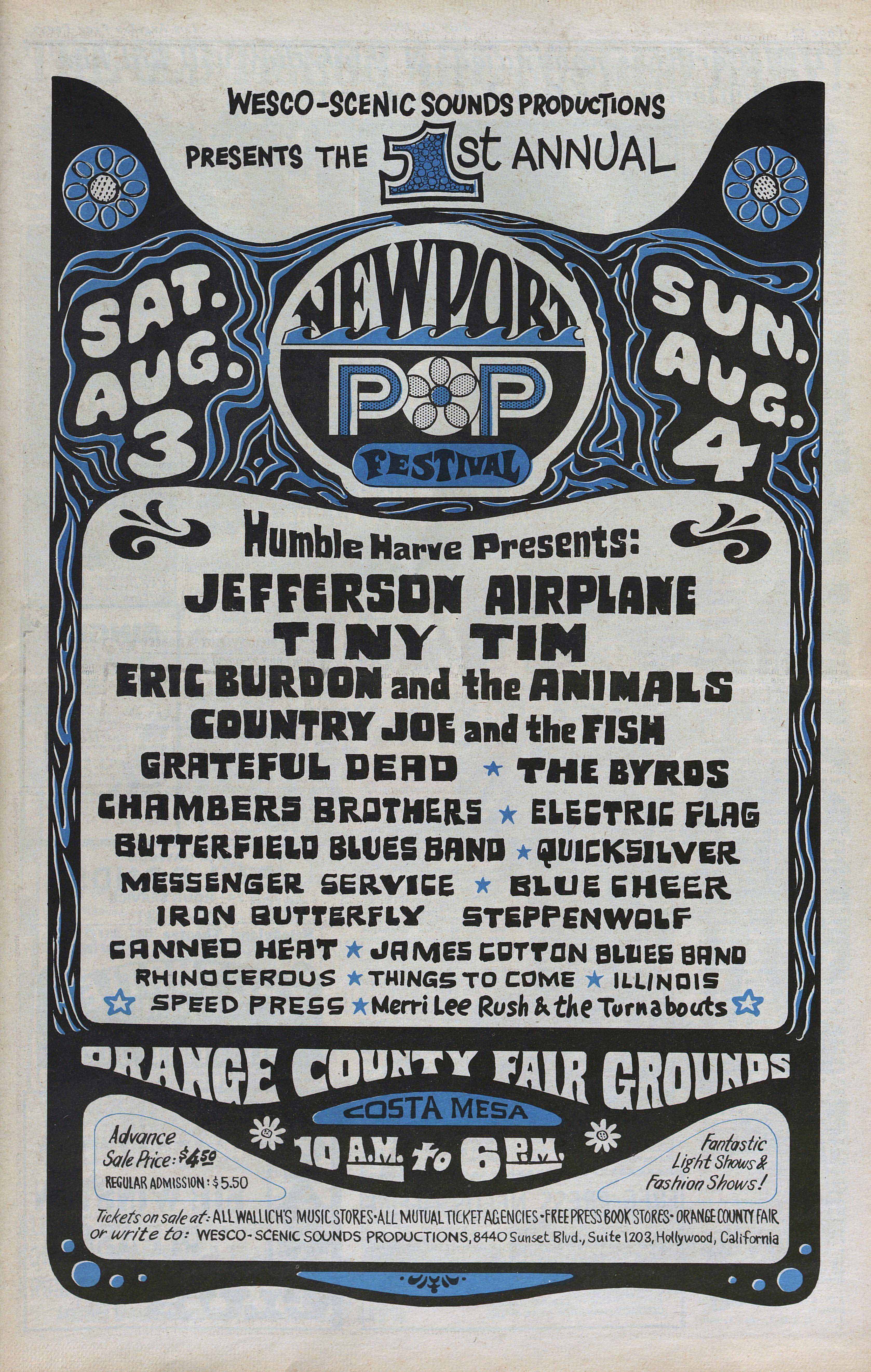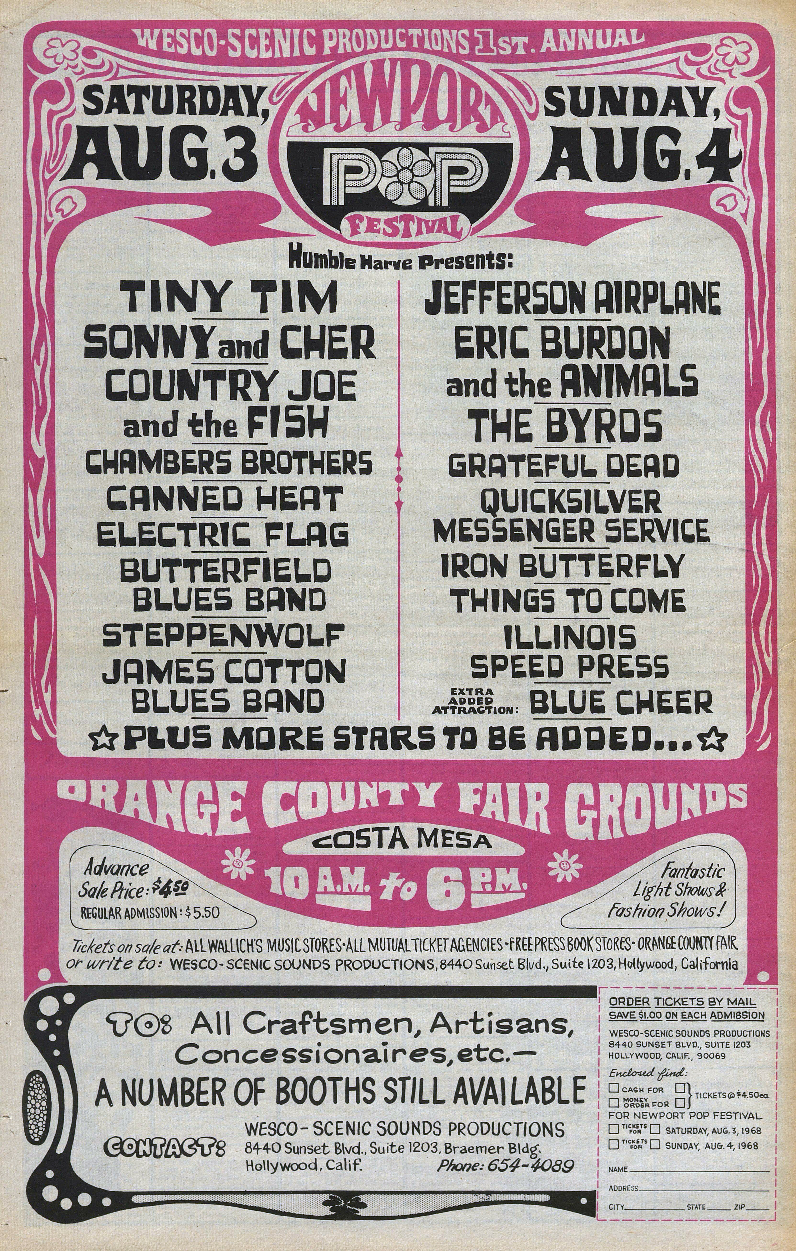 Alice Cooper, Tiny Tim, James Cotton Blues Band, Sonny & Cher, Steppenwolf, Gypsy Boots, Kim Fowley, Canned Heat, Chambers Brothers, Electric Flag, Paul Butterfield Blues Band, Blue Cheer, Charles Lloyd, Country Joe & the Fish, The Byrds, Quicksilver Messenger Service, Iron Butterfly, Eric Burdon & the Animals, and Jefferson Airplane