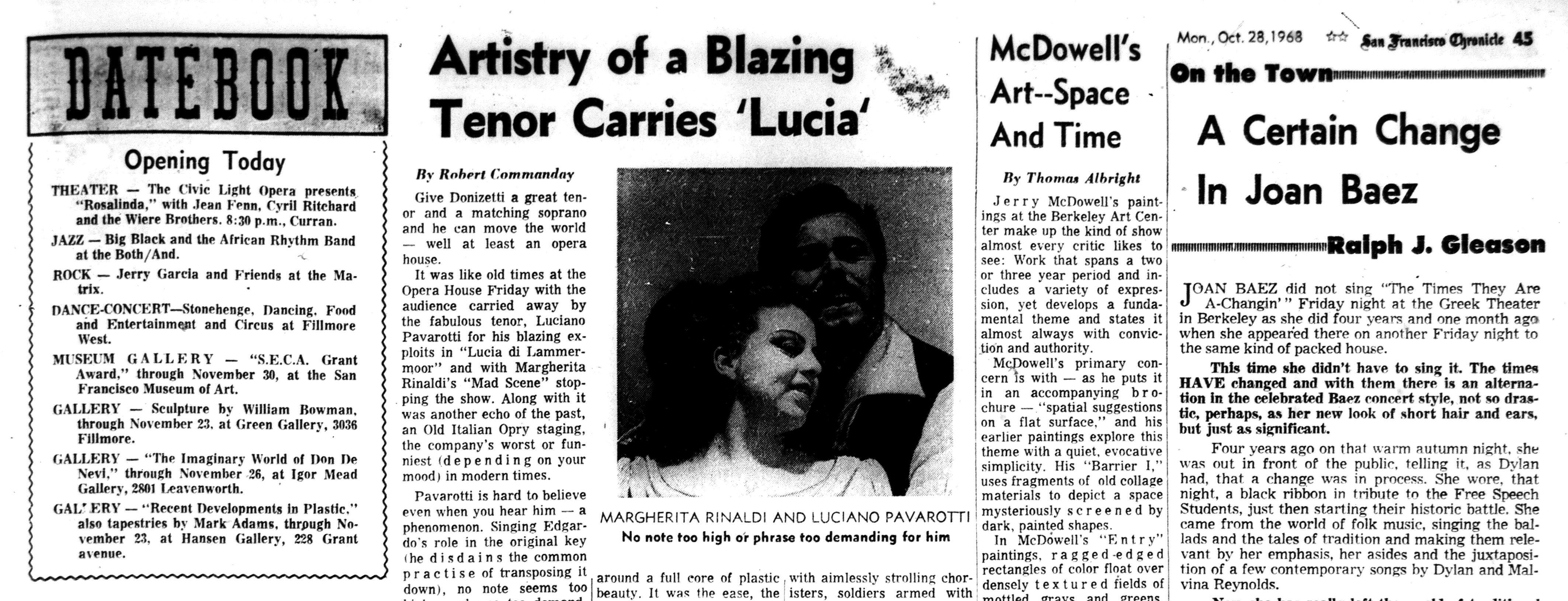 listing: "Datebook," San Francisco Chronicle, October 28, 1968, p. 45, showing "Jerry Garcia and Friends" opening this night.