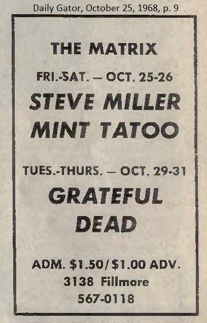 listing: San Francisco Examiner, October 29, 1968, p. 27, billing Jerry Garcia (late of the Grateful Dead)