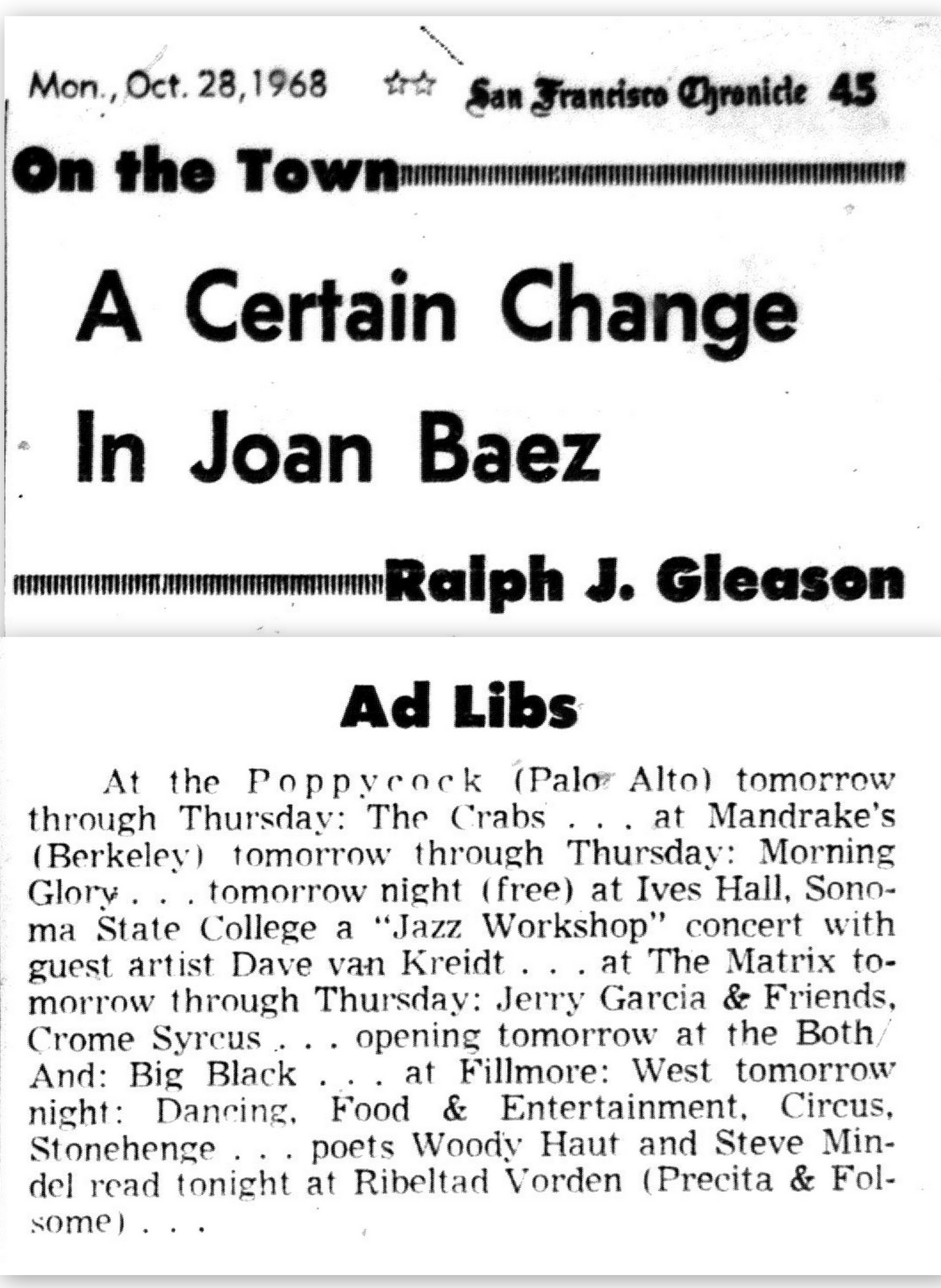 , October 28, 1968, p. 45, billing Jerry Garcia and Friends