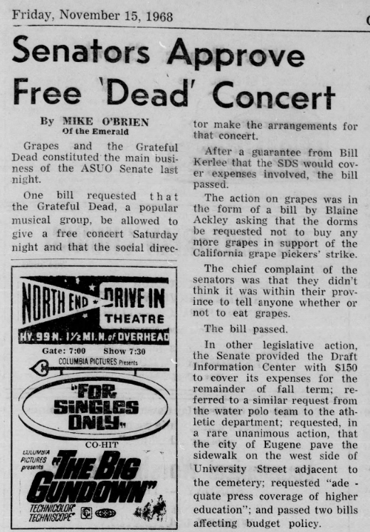 November 15, 1968 Coliseum, Oregon State University, Corvallis, OR: Grateful Dead/Mint Tattoo/City Blue (LIA comment)