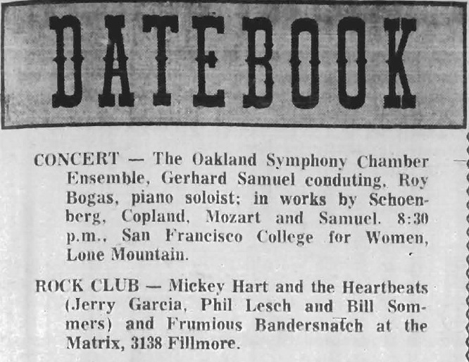 , February 24, 1969, p. 37, billing "Mickey Hart and the Hartbeats (Jerry Garcia, Phil Lesch, and Bill Sommers)"