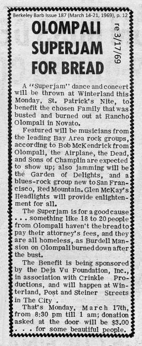 announce: "Olompali Superjam for Bread," Berkeley Barb no. 187 (March 14-21, 1969), p. 12
