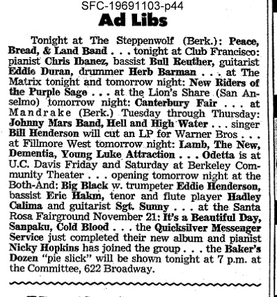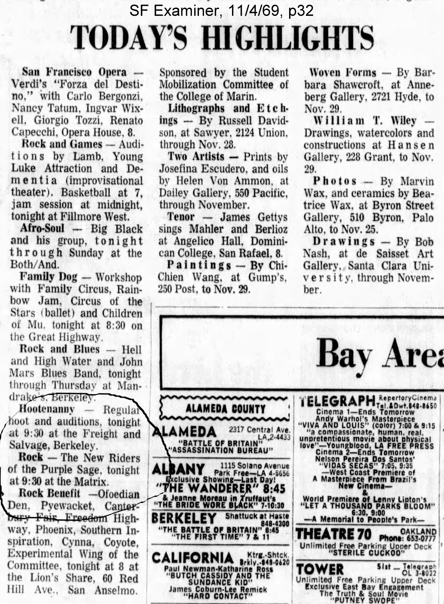 Grateful Dead/Jerry Garcia Tour Itinerary November 1969