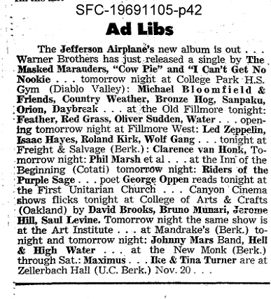 listings: San Francisco Chronicle, November 5, 1969, p. 42, billing "Riders of the Purple Sage" | Leslie Johnson, "Be It Legal or Not," Oak Leaf, November 6, 1969, p. 3