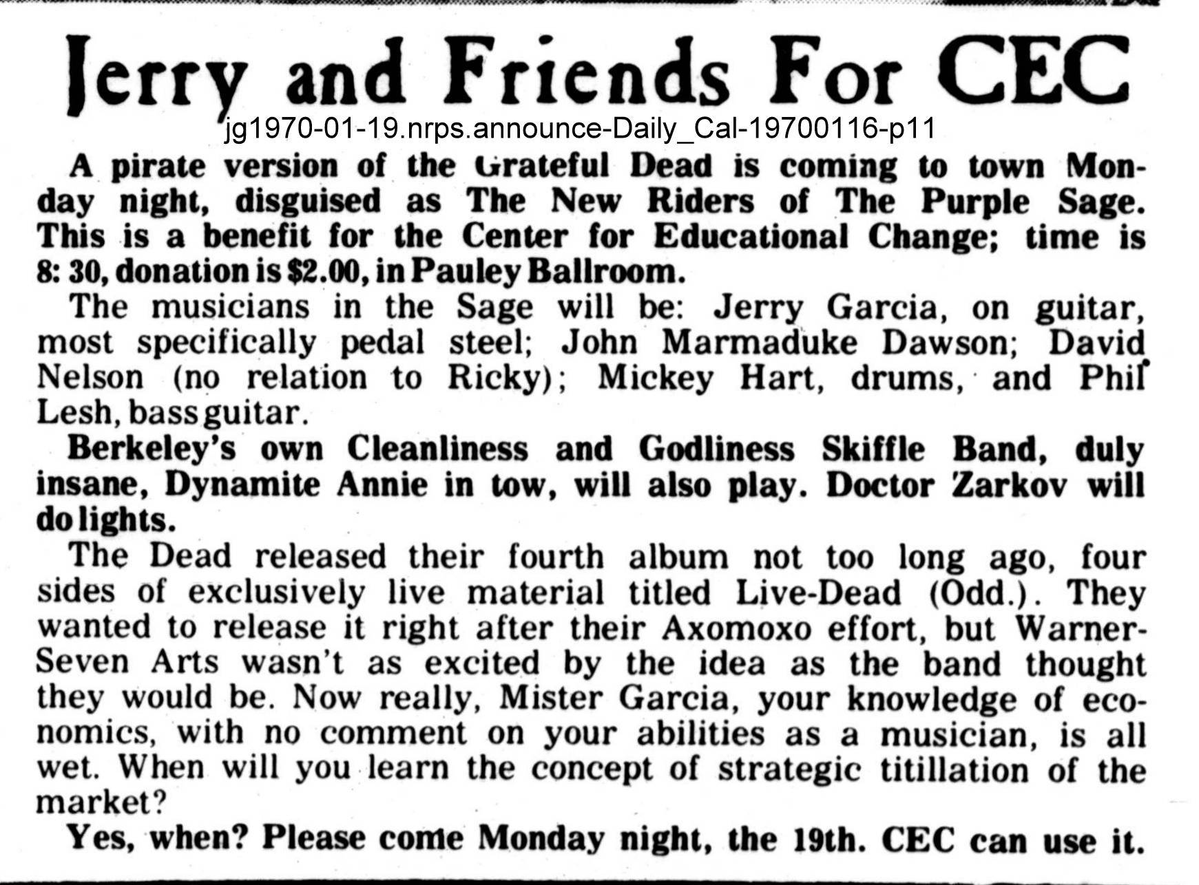 announce: "Jerry and Friends for CEC", Daily Californian, January 16, 1970, p. 11: calls the NRPS "a pirate version of the Grateful Dead" and namechecks Phil Lesh. This gig, and the putative March gigs, might be Lesh's only NRPS gigs, but that remains speculative.