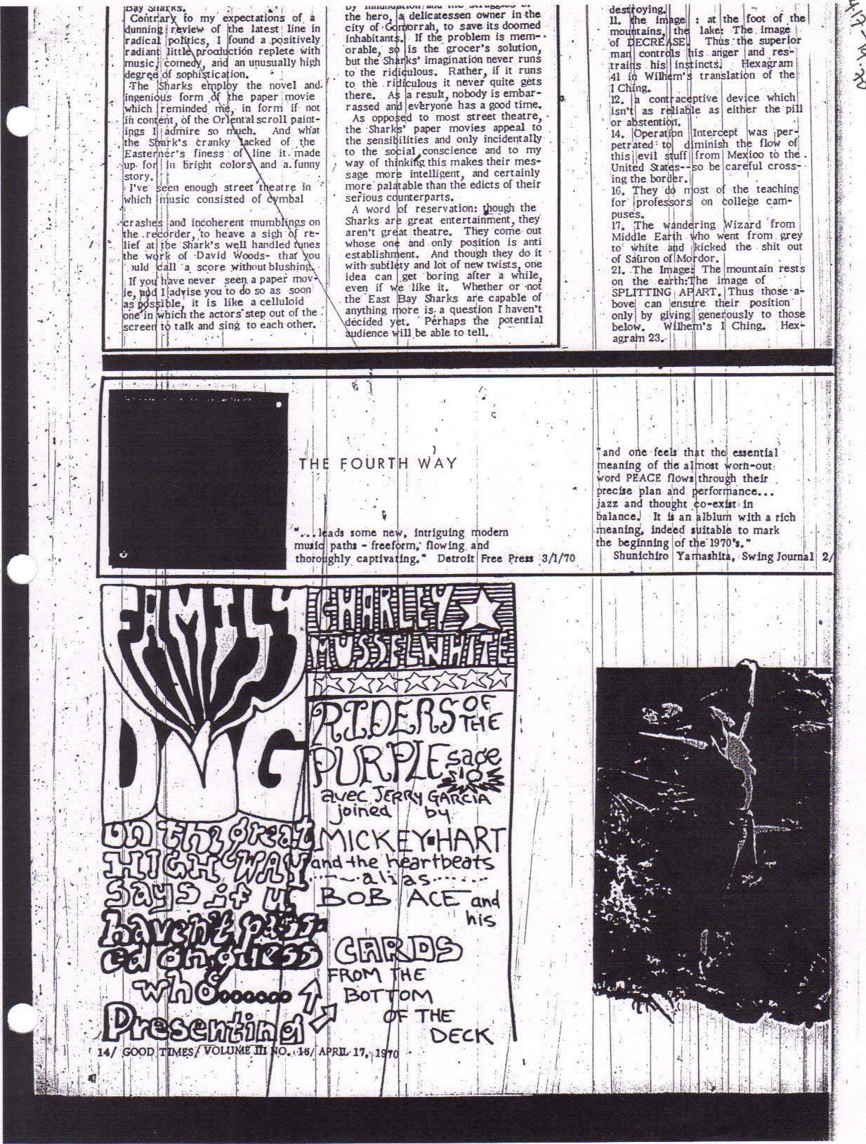 ad: Good Times v3 n16 (April 17, 1970), p. 14, billing Billed as "Riders of the Purple Sage avec Jerry Garcia, joined by Mickey Hart and the Heartbeats alias Bob Ace and his Cards From the Bottom of the Deck".
