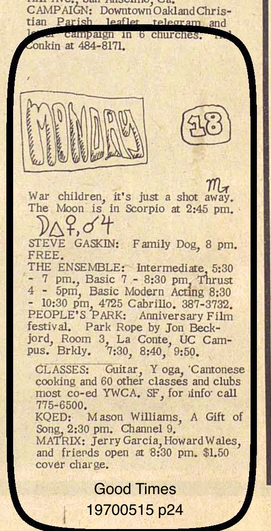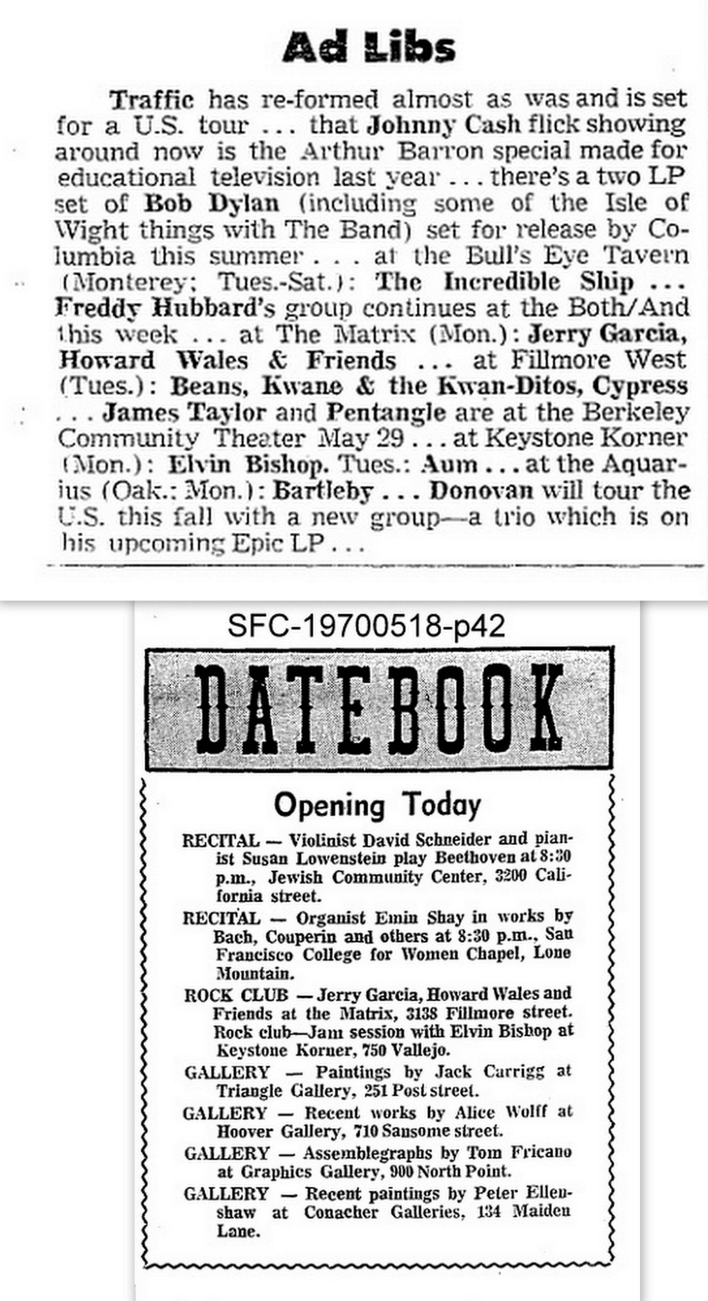 listings: Good Times v.3 n.20 (May 15, 1970), p. 24; Berkeley Tribe, v2 n19 (issue #45), p. 24 |San Francisco Chronicle, May 18, 1970, p. 42, all billing "Jerry Garcia, Howard Wales & Friends"