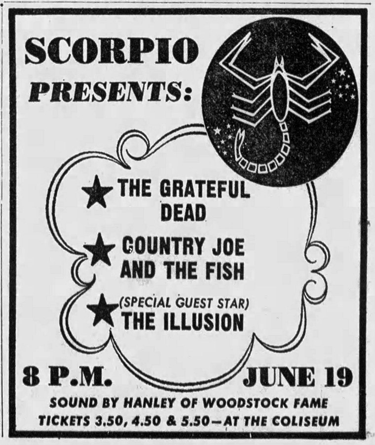 expost: Carolyn White, "Acid Rock Beat Flattens Wallet of Producer, 20," Commercial Appeal (Memphis, TN), June 20, 1970, 12. Scorpio Productions put the show on, lost a bundle. Cost $15k to put on, needed 5k attendance to break even, got 2,054 to come.