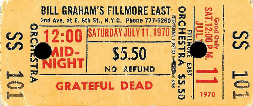 Ed Perlstein recollection (Facebook, 7/11/2012): "Dead at Midnight - Fillmore East - July 11, 1970. According to my notes (my memory sucks), the show started at 12:20 AM and ended at 5:30 AM. I remember walking out of the Fillmore East to the rising sun."