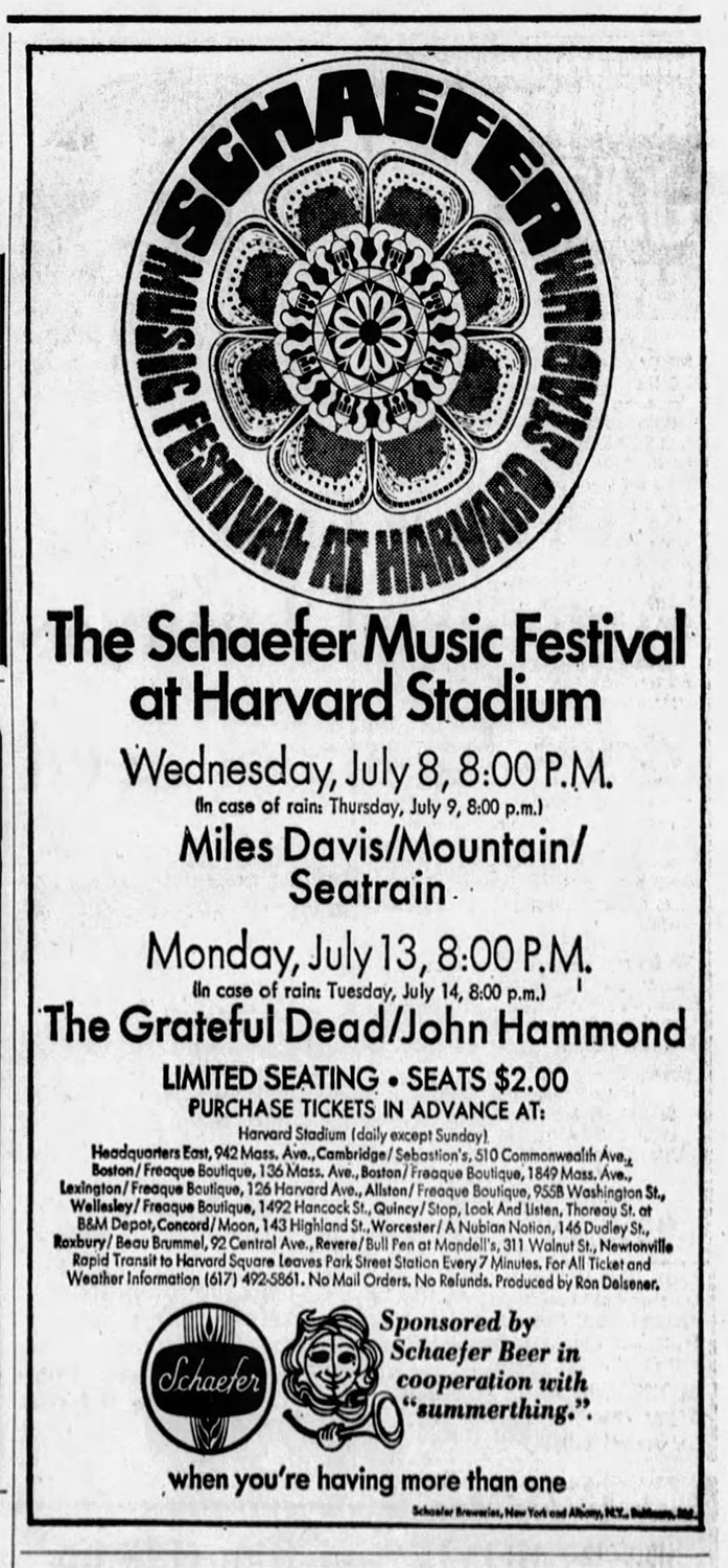Brandon Smith: "The Dead were booked to play July 13, 1970 at Harvard Stadium in Allston, MA as part of the Schaefer Music Festival with John Hammond. [A pamphlet] identifies the lineup for the entire series sponsored by Schaefer Beer that summer (notice that the August 12th date was Janis Joplin’s last show before she died). A 7/10/70 article said the Dead had cancelled on that Wednesday (7/8/70) with no explanation, and were replaced with the Chambers Brothers (known for their hit “Time Has Come Today”). Thanks to Brandon and Corry for forwarding info.