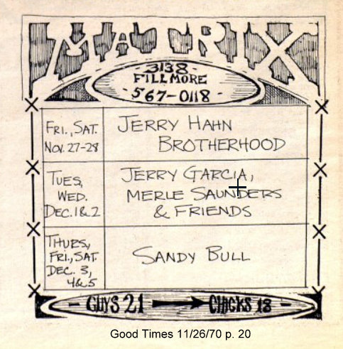 ad: Good Times v.3 n.47 (November 26, 1970), p. 20 (billing "Jerry Garcia, Merle [sic] Saunders & Friends")