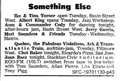 listings: San Francisco Chronicle, November 30, 1970, p. 43 (billing "Jerry Garcia, Merl Saunders and Friends") |San Francisco Examiner, December 1, 1970, p. 35