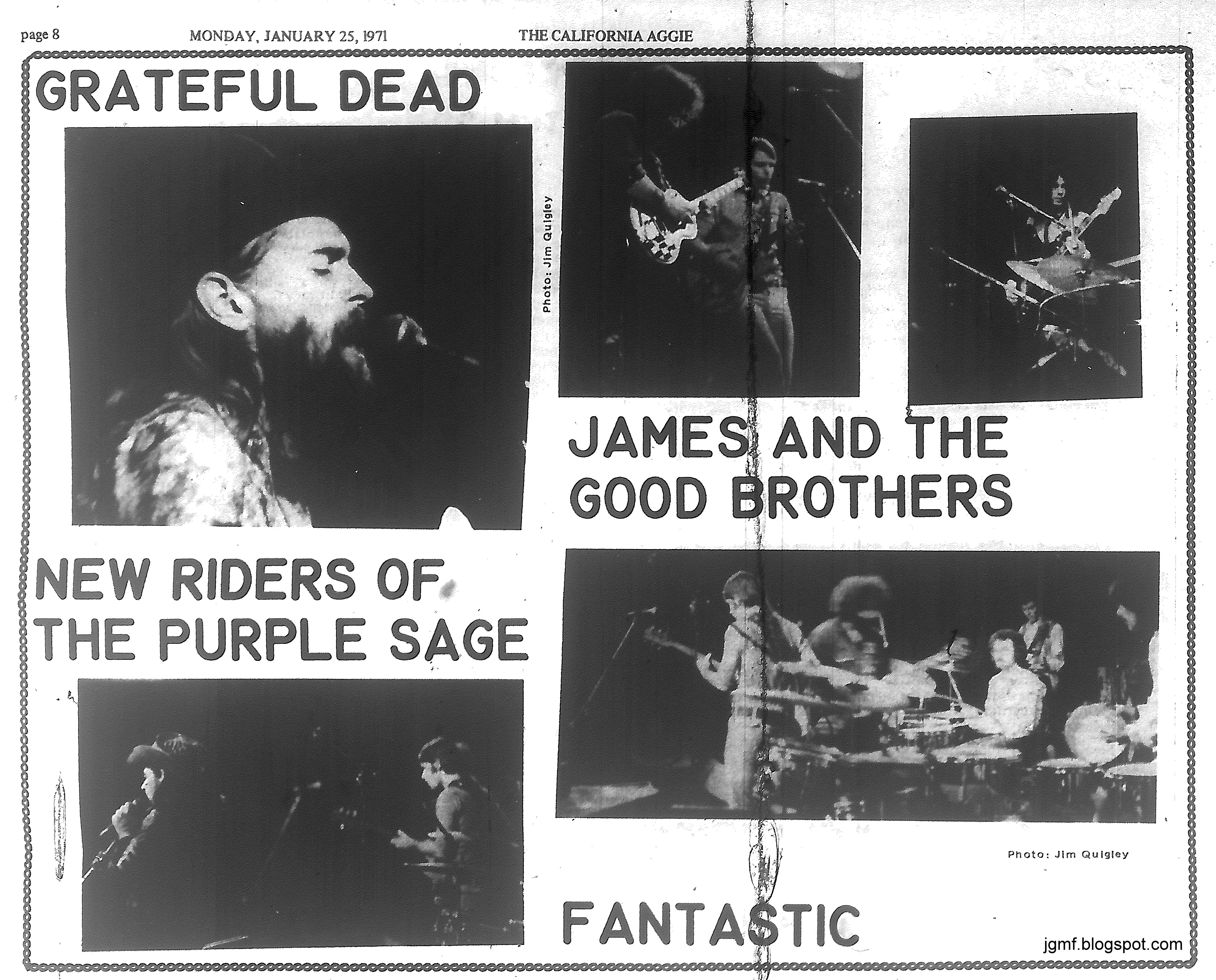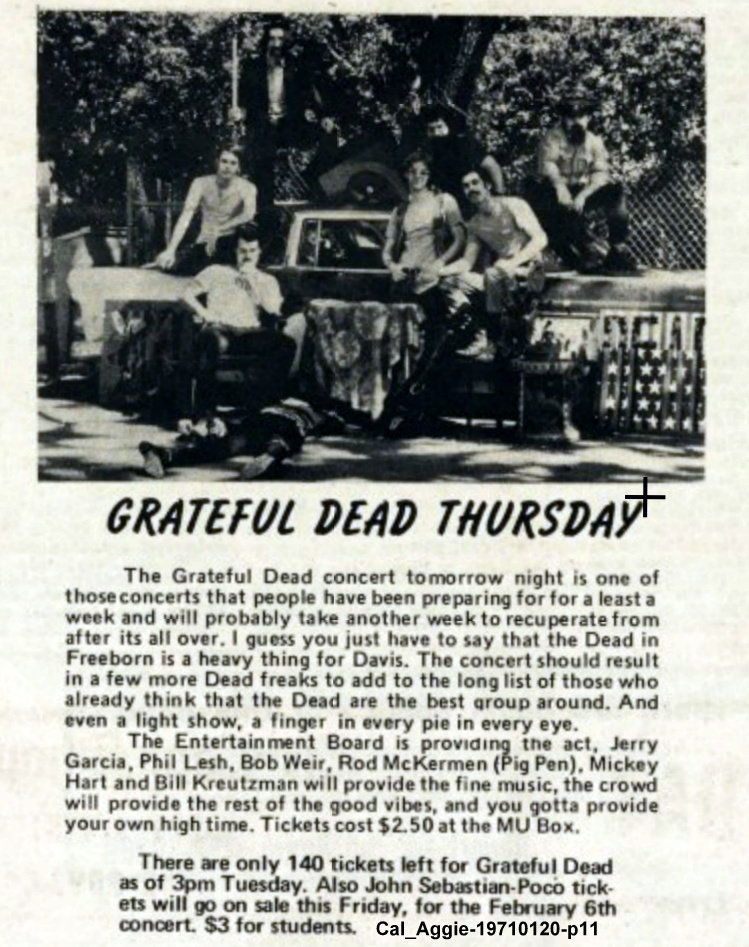 previews: "Grateful Dead appear in concert at Freeborn," Daily Democrat, January 16, 1971, p. 4 |California Aggie, January 20, 1971, p. 11