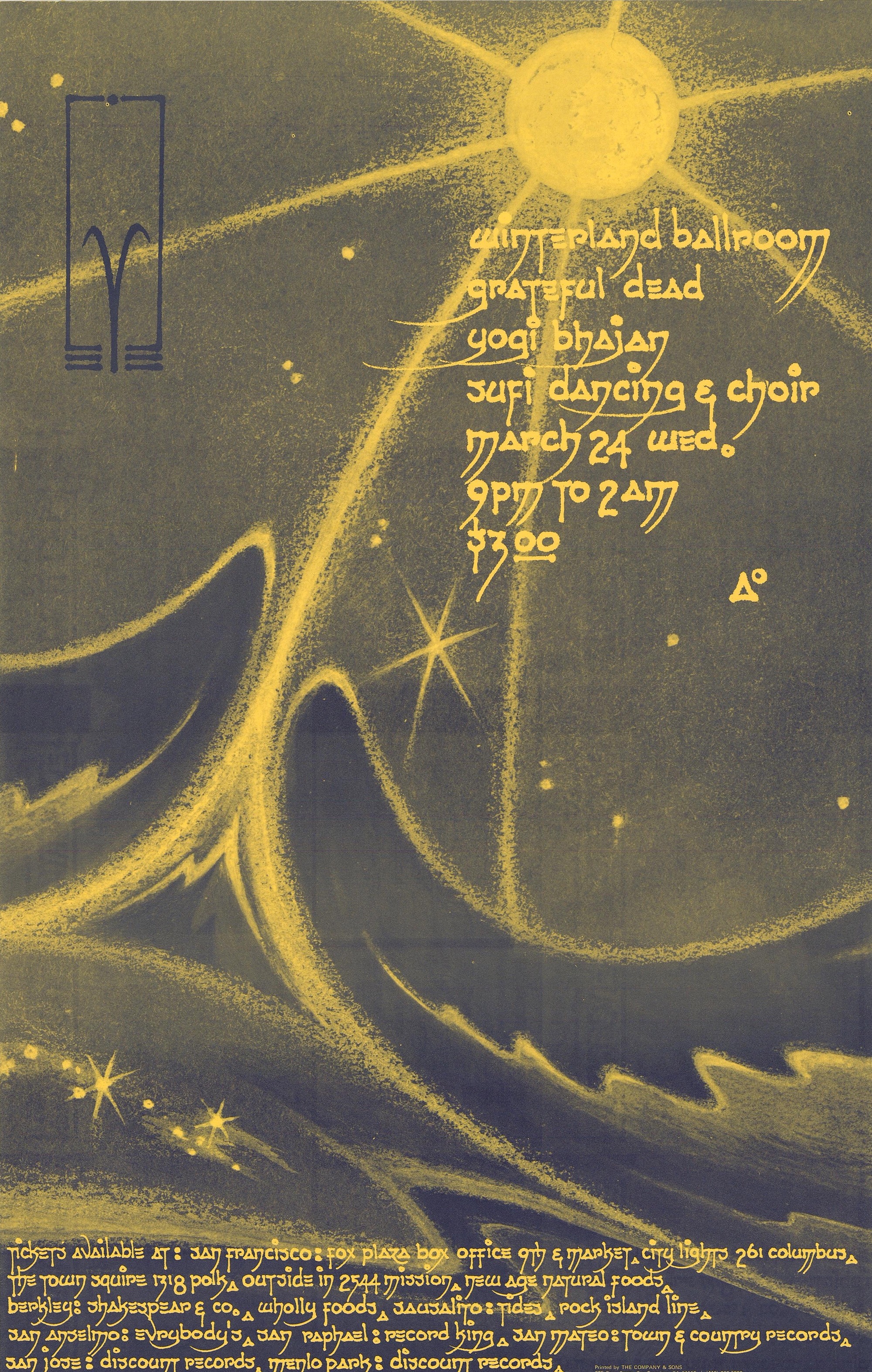 Benefit for the Sufi Choir of San Francisco. LIA says NRPS did not appear. This seems to be the night that Tom Davis first met Jerry, wandering unimpeded up onto the stage.