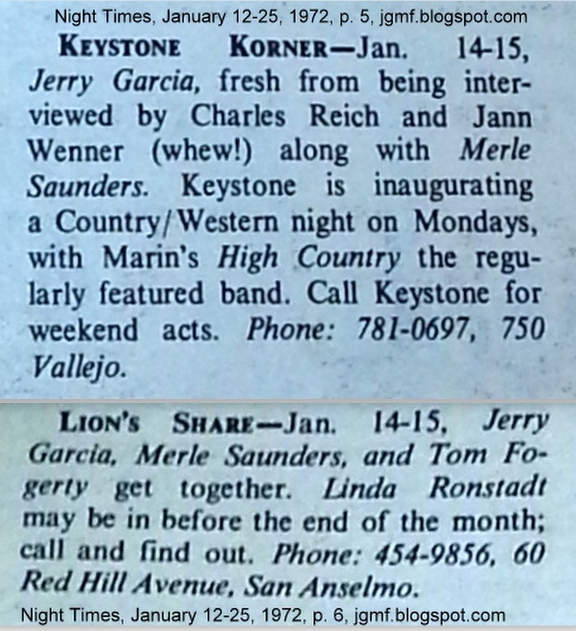 listing: [contra] Night Times, January 12-25, 1972, p. 6 (giving venue as Lion's Share). NB a correct listing appeared on the prior page.