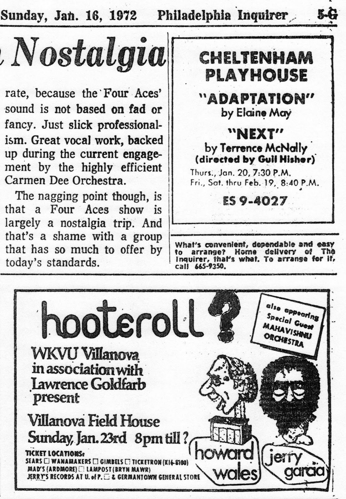 previews: "Villanova Concert," Philadelphia Daily News, January 14, 1972, p. unk |Philadelphia Inquirer, January 21, 1972, p. unk