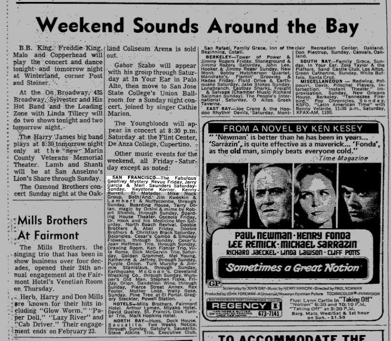 • The 3rd and 4th were listed in Deadbase, but news listings show an escape artist named Geoffrey. Whether the shows on the 3rd and 4th happened at the Keystone, the Lion's Share or not at all is in some doubt. See lostlivedead: February 5, 1972 Keystone Korner, San Francisco: Jerry Garcia/Merl Saunders for a little discussion.