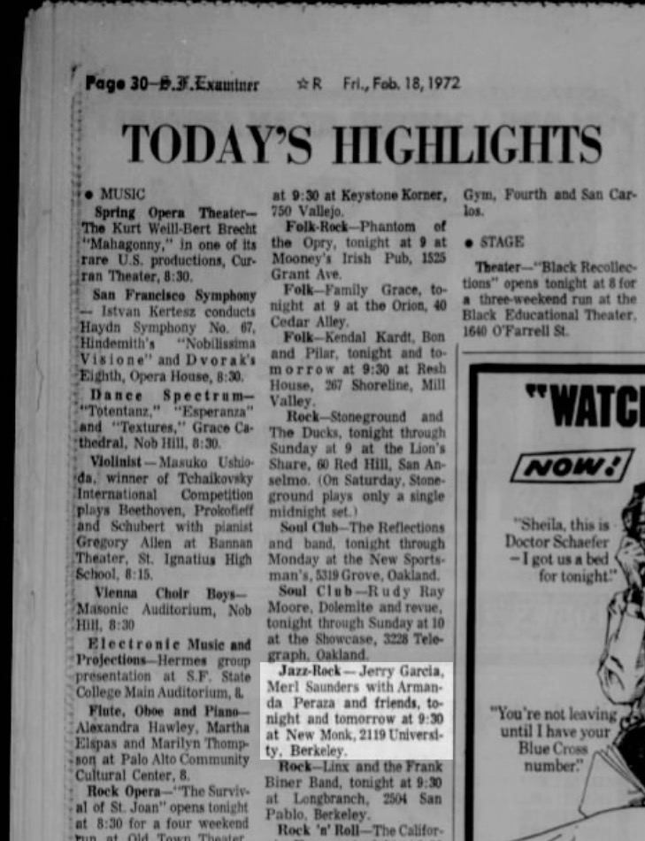 , February 18, 1972, p. 30, billing "Jerry Garcia, Merl Saunders, with Armando Peraza and friends"