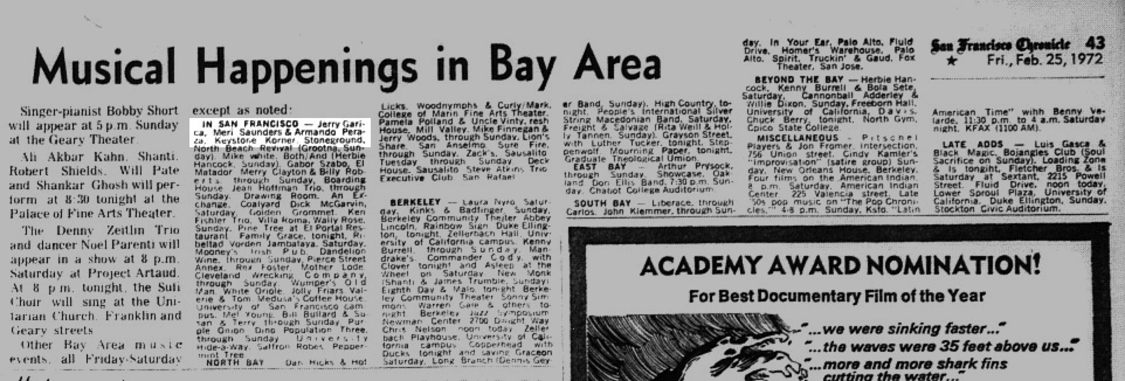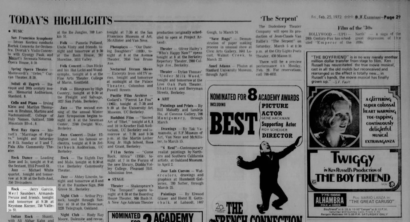 listings: Hayward Daily Review, February 24, 1972, p. 25 (billing "Jerry Garcia") |San Francisco Chronicle, February 25, 1972, p. 43 (billing Jerry Garcia, Merl Saunders and Armando Perazza) |San Francisco Examiner, Febrruary 25, 1972, p. 29
