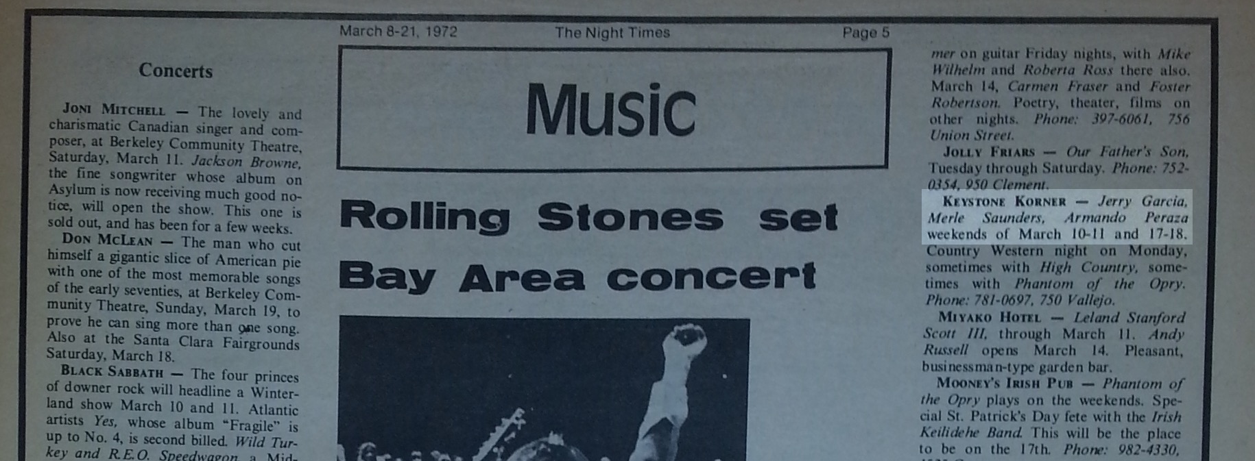 , March 8-21, 1972, p. 5, billing Jerry Garcia, Merle [sic] Saunders, Armando Peraza