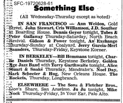 listings: San Francisco Chronicle, June 28, 1972, p. 61, billing Jerry Garcia - Merl Saunders |San Francisco Examiner, June 29, 1972, p. 33, billing Jerry Garcia and Merle [sic] Saunders and Friends
