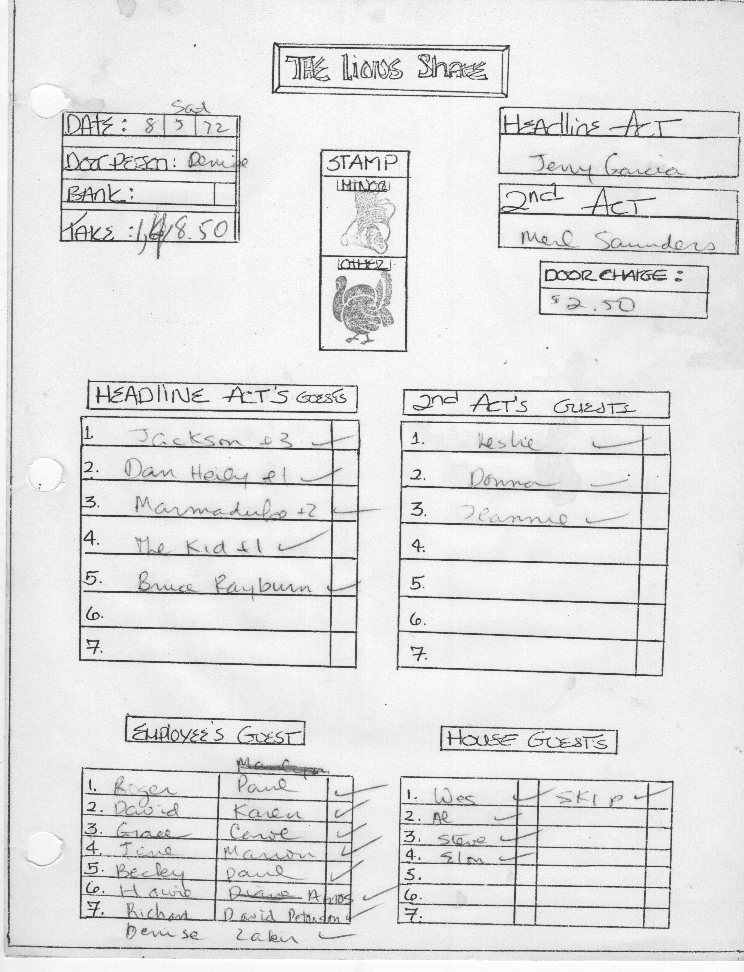 Per Kurt Huget, house took $1,418.50 for the night, though it's a little hard to read. With ca. 200 @ $2.50 admission, that would suggest that every attendee bought $5 in drinks and whatever food was on hand. We do note that Garcia's guests included Rex Jackson +3, Dan Healy +1, Marmaduke +2, and Kidd +1, so big bar take might make perfect sense.