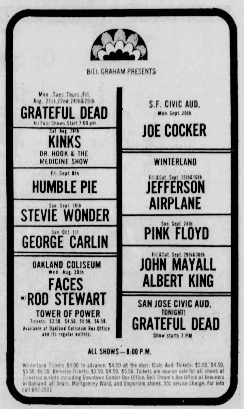 mention: Wasserman, John L. 1972. Lively Arts: New Band on the Move. San Francisco Sunday Examiner & Chronicle Datebook, September 3, 1972, p. unk, I believe it was usually around the 25-30 range. "The Grateful Dead drew a capacity 14,400 to four concerts recently at Berkeley Community Theater but, according to some reports, were not as together as they have been known to be on occasion. Stanley Owsley or Owsley Stanley, not former manufacturer of LSD, is now out of the slammer and handled the Dead's sound."