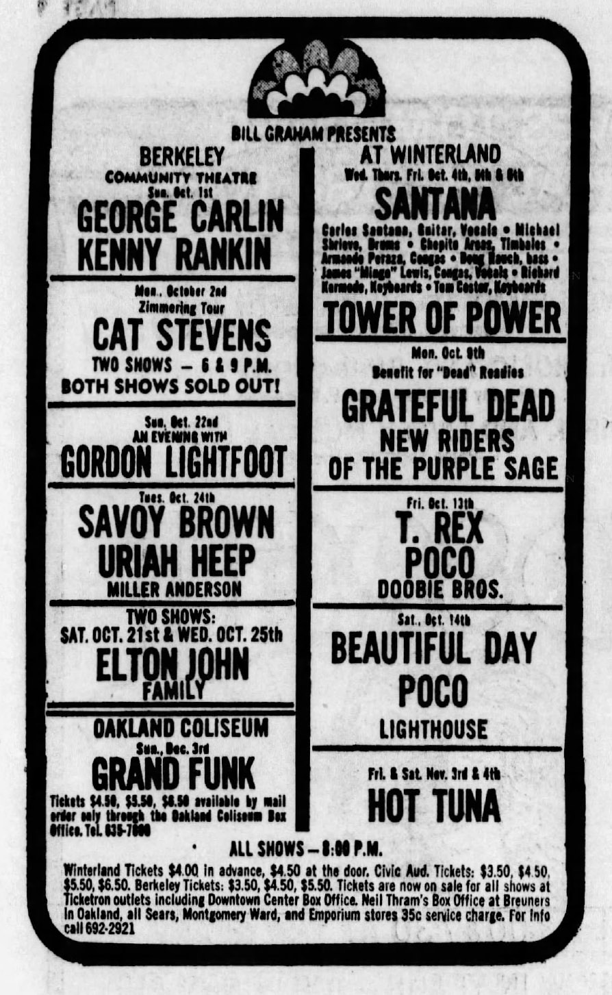 listing: "Datebook," San Francisco Chronicle, October 9, 1972, p. 40;