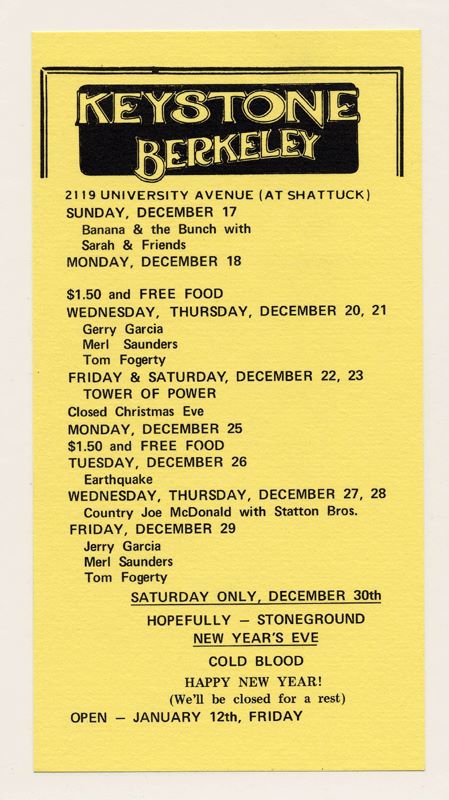 Keystone calendar: "Jerry Garcia, Merl Saunders, Tom Fogerty". We believe this to be Tom Fogerty's last gig with JGMS, despite his name continuing to appear on some billings into 1973.