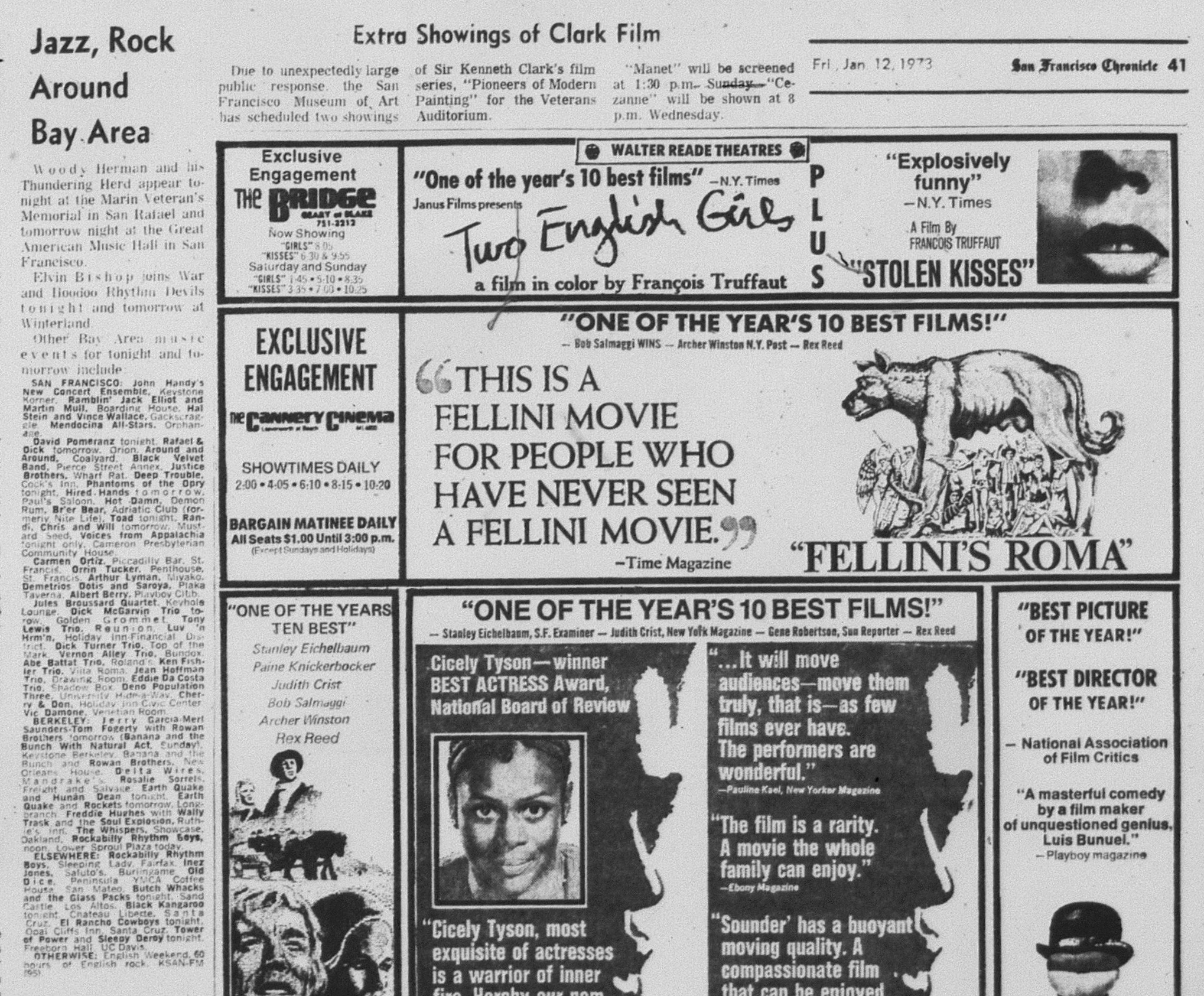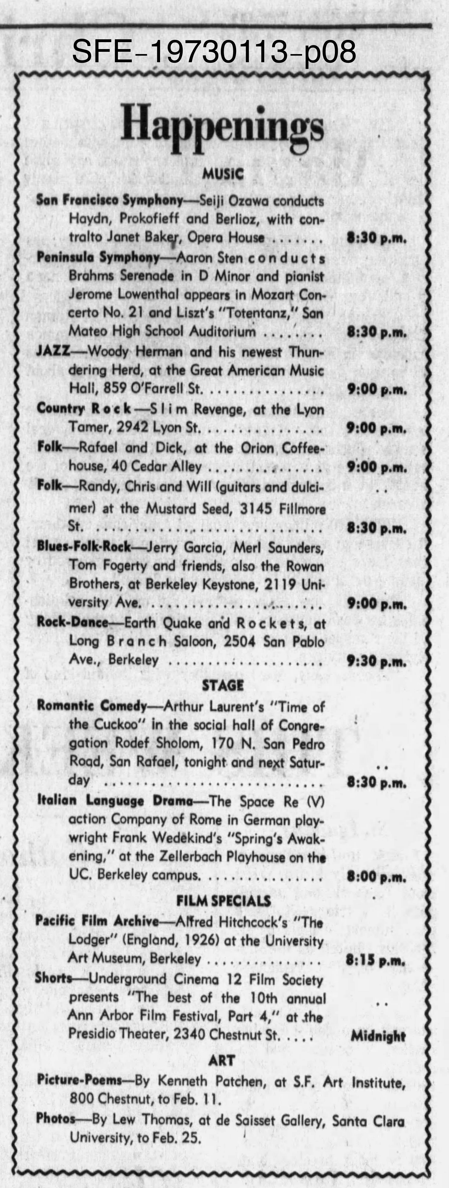 listings: "Scenedrome," Berkeley Barb, January 12-18, 1973, p. 28 |San Francisco Chronicle, January 12, 1973, p. 41 |San Francisco Examiner, January 13, 1973, p. 8