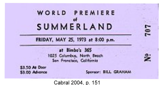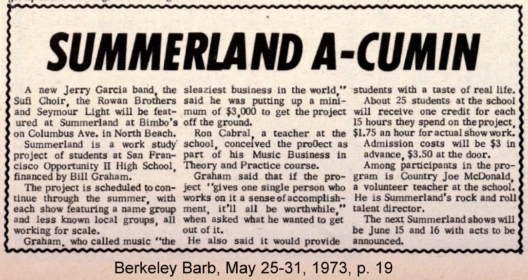 previews: "Summerland-a-Comin," Berkeley Barb, May 25-31, 1973, p. 19 | "Summerland Concert Tonight," Stanford Daily, May 25, 1973, p. 5