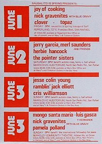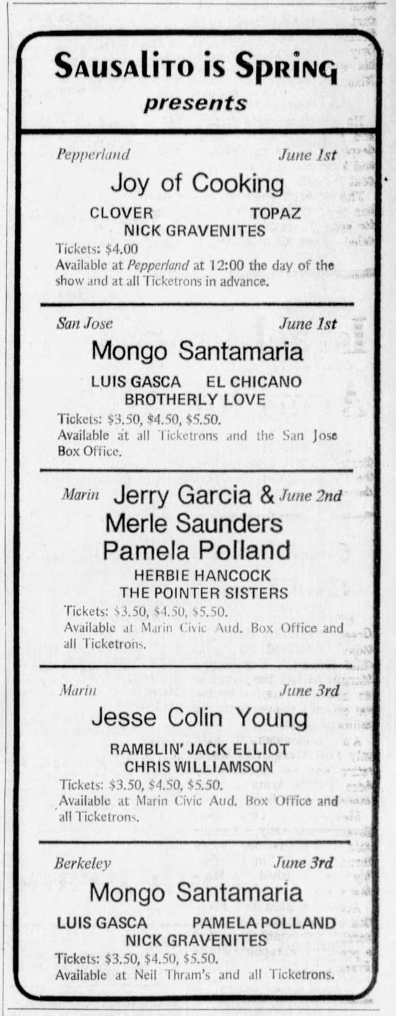 listings: "Scenedrome," Berkeley Barb, June 1-7, 1973, p. 22 |San Francisco Chronicle, June 1, 1973, p. 48 |San Francisco Examiner, June 2, 1973, p. 10