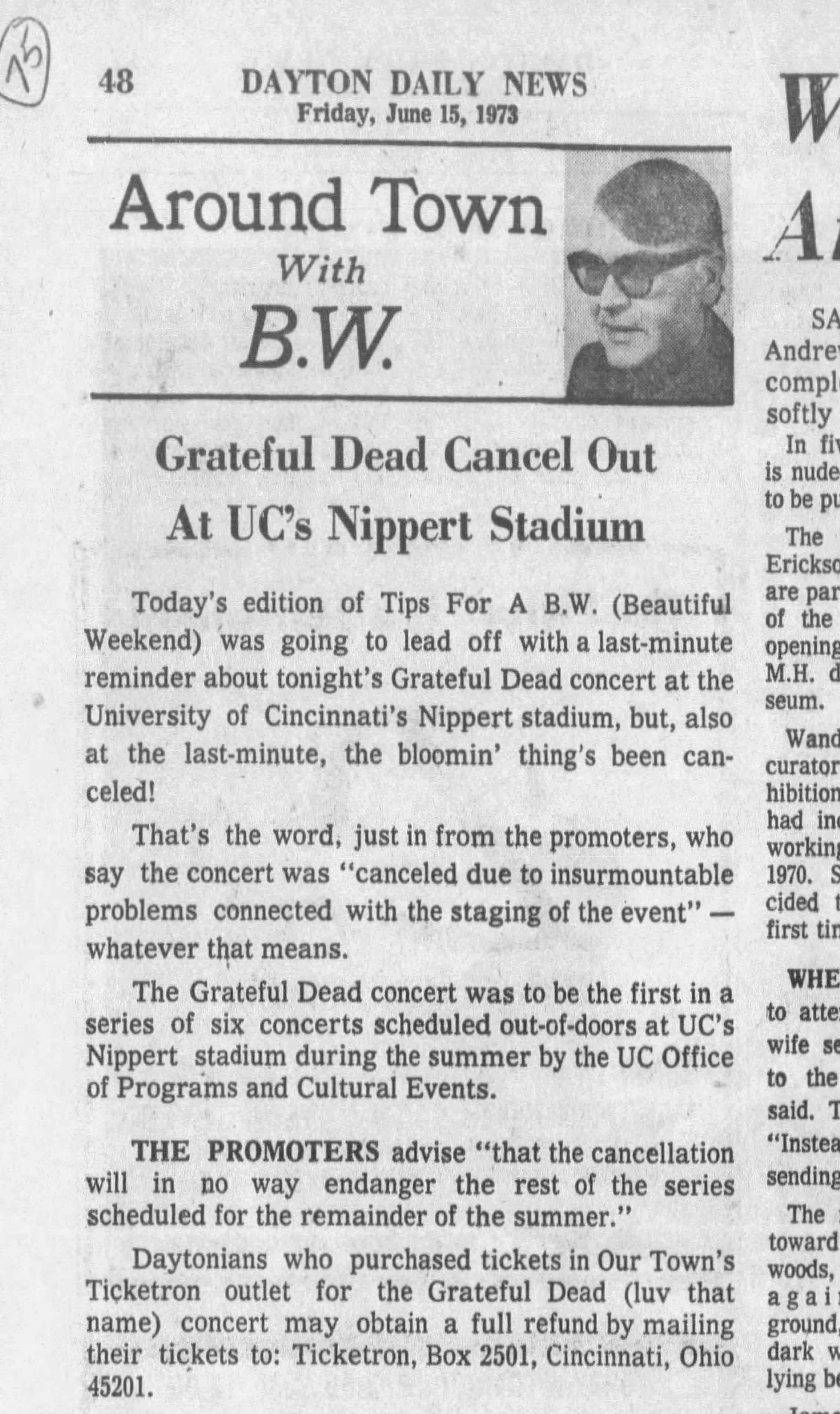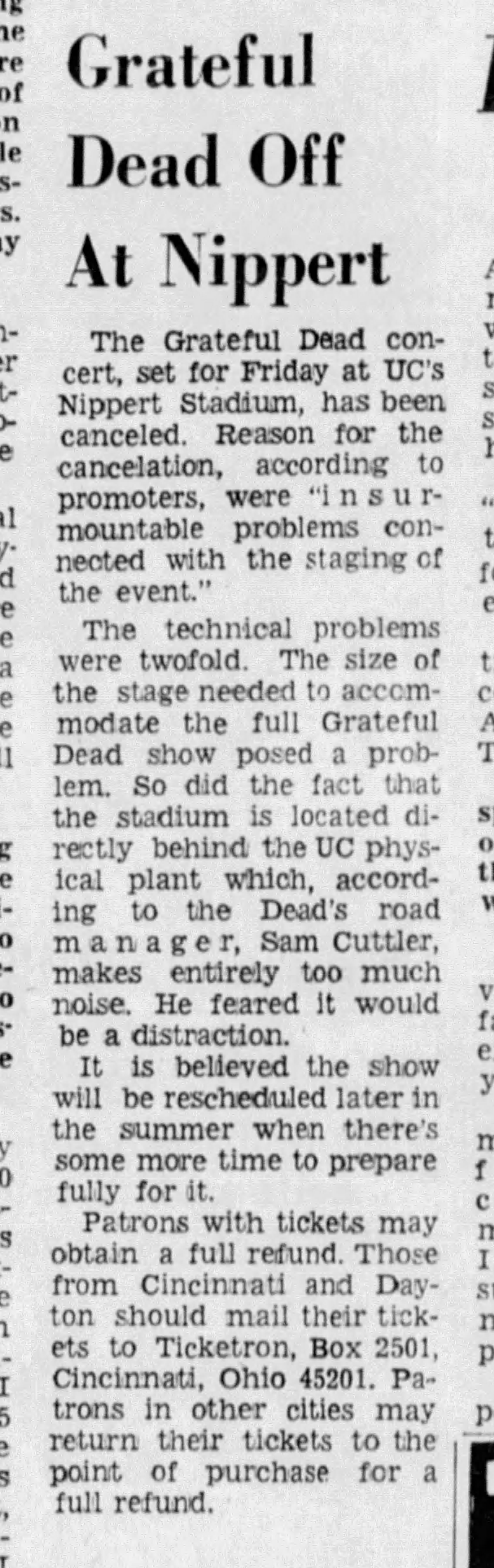 cxl: "Grateful Dead Off at Nippert," Cincinnati Inquirer, June 14, 1973, p. unk; B.W., "Grateful Dead Cancel Out At UC's Nippert Stadium," Dayton Daily News, June 15, 1973, p. 48. They had problems staging all of the Dead's gear, and the campus power plant was right behind the stage, creating noise and whatnot, per Sam Cutler. Thanks to Jesse Jarnow for these sources.
