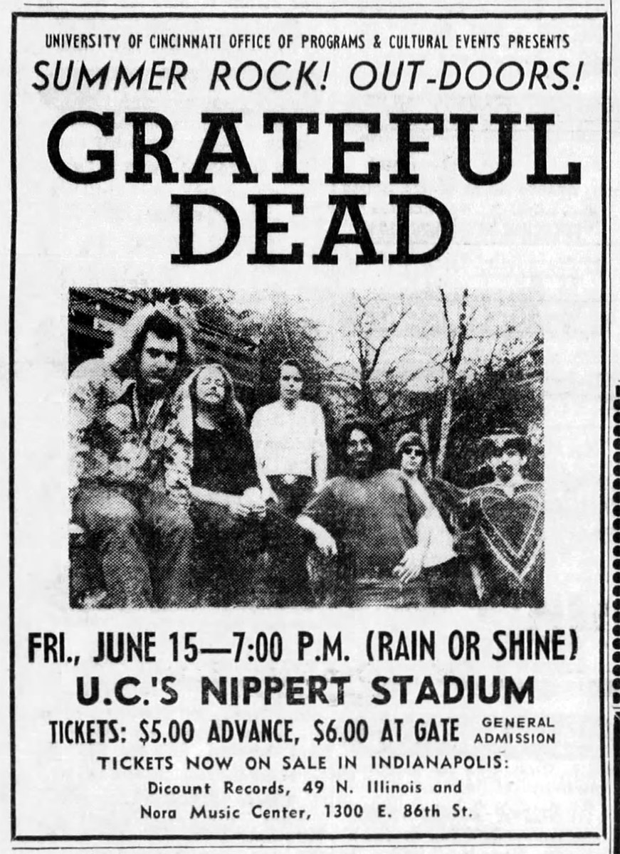 ad: Indianapolis Star, June 3 or 10, 1973, p. unk, via David Davis. University of Cincinatti Office of Programs & Cultural Events Presents (Summer Rock! Outdoors!) Grateful Dead. Accompanyng pic includes Pigpen. Rain or shine. NB source is Indy Star via David Davis, and ad says "Tickets now on sale in Indianapolis". Rain or shine, $5 advance and $6 gate, all general admission.