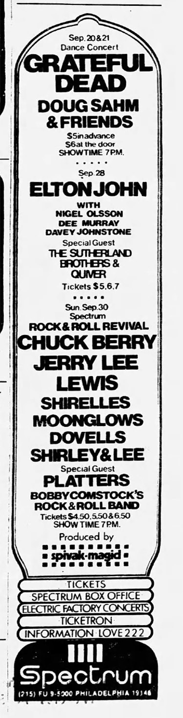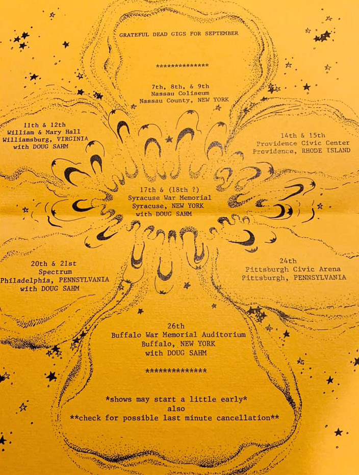 [1] Hideaway noodling before [2] Includes Phil 6/8 Time Jazz Jam [3] Last known performance (by GD) 1972-09-21 (76 events ago) [4] Light Into Ashes blogger calls this a "brief undeveloped version in a rollicking upbeat style" [5] Final known performance [6] With Martin Fierro on saxophone [7] With Joe Ellis on trumpet