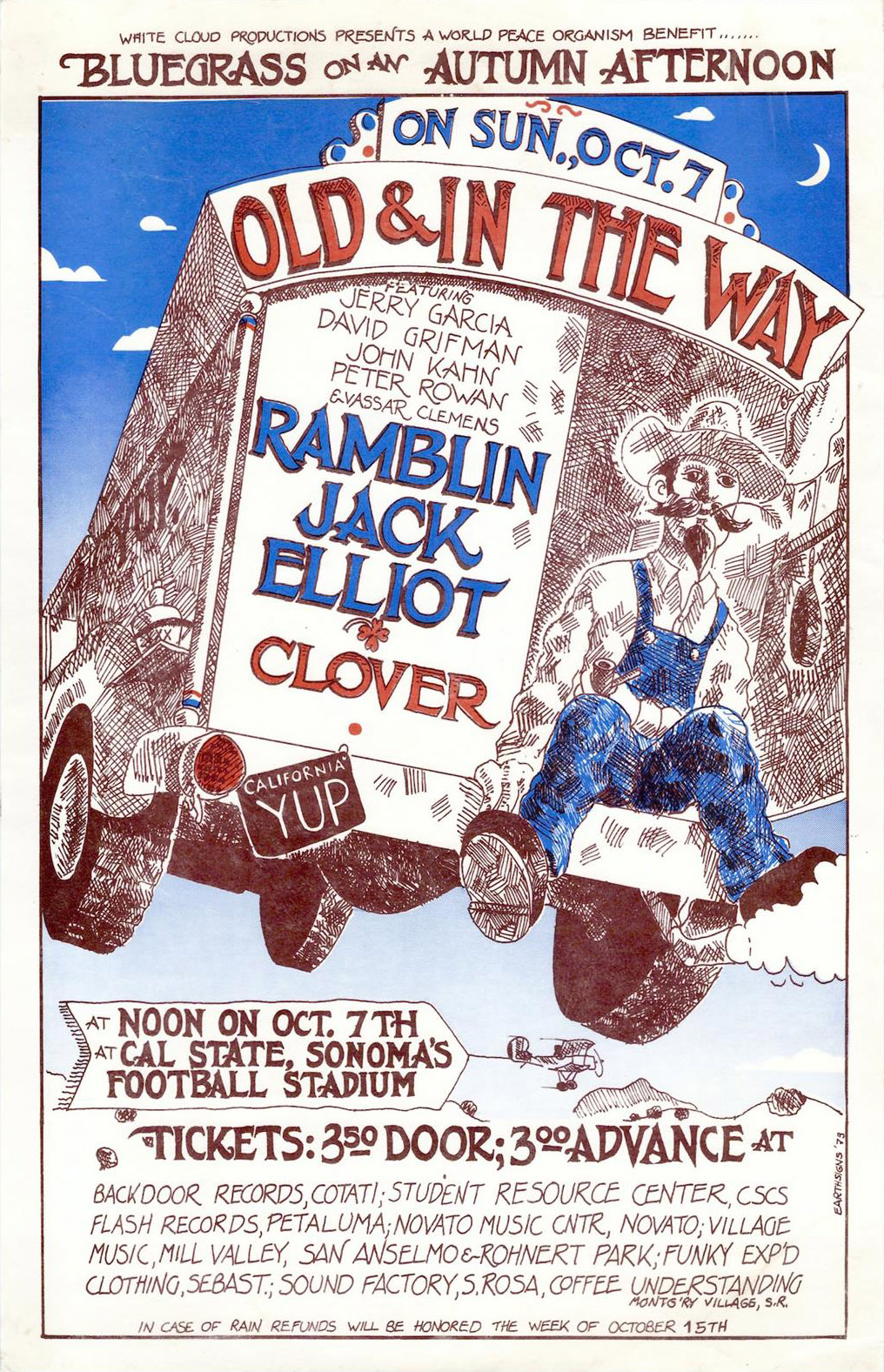 Rescheduled for 11/4/73. White Cloud Productions - a World Peace Organism Benefit - "Bluegrass on an Autumn Afternoon". OAITW featuring Jerry Garcia, David Grifman [sic], John Kahn, Peter Rowan [smaller text?] & Vassar Clements." Note at bottom: "In case of rain, refunds will be honored the week of October 15th."