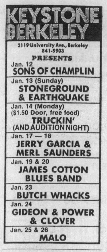 listings: Hayward Daily Review, January 11, 1974, p. 42 |San Francisco Examiner, January 11, 1974, p. 37 |San Francisco Sunday Examiner and Chronicle Datebook, January 13, 1974, p. 4 |San Francisco Examiner, January 17, 1974, p. 28