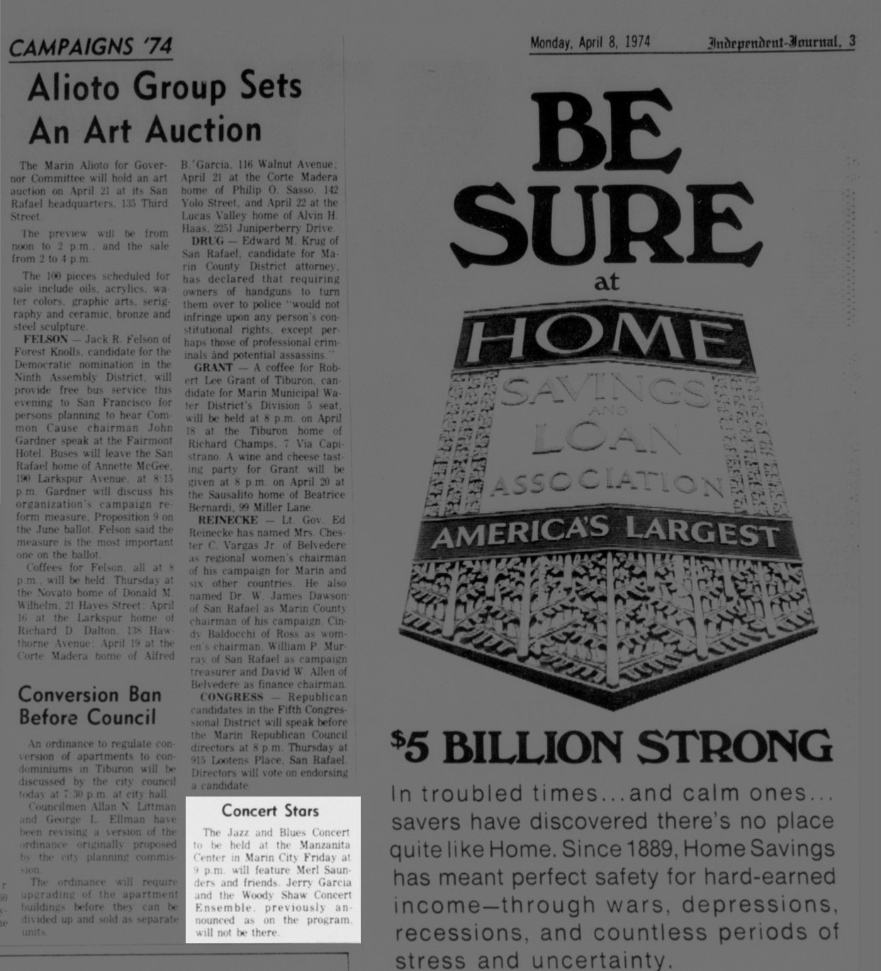 cxl: "Concert Stars," Independent-Journal, April 8, 1974, p. 3: "Jerry Garcia … previously announced on the program, will not be there". The Jazz and Blues Concert will be headlined by Merl Saunders and Friends.