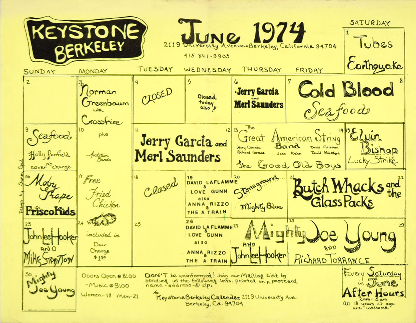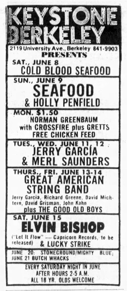 Although there are two ads that list an additional Jerry & Merl show at the Keystone on the 12th, we are quite certain Garcia was playing with the GASB that night at the Lions Share. John Kahn was in Albuquerque playing with Maria's band this night (h/t nick), so we don't know who played bass. We would guess Tony Saunders.