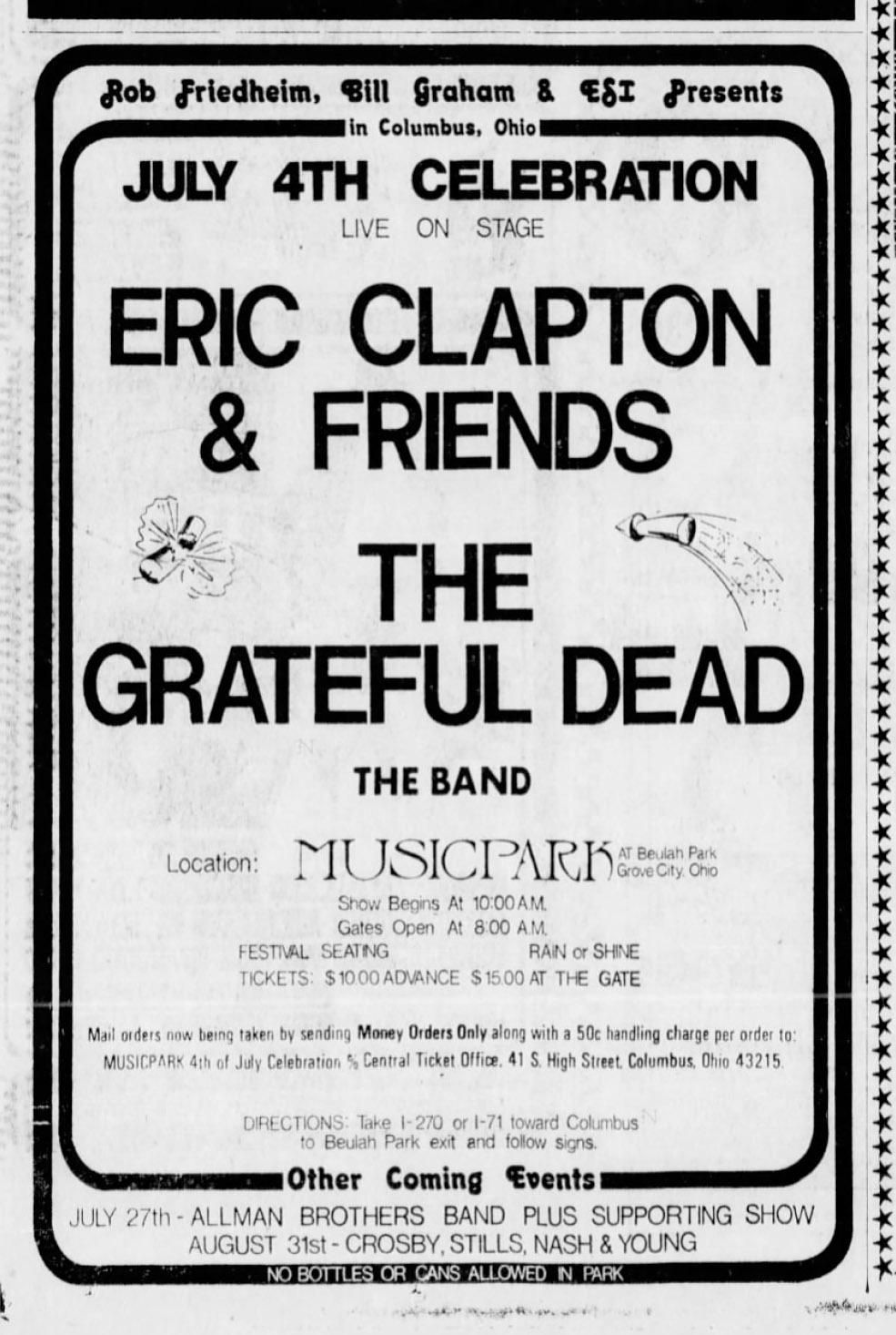 LIA to CXL: A 1974 article "explains that the GD had dropped out of a prospective 'July 4th superconcert' in Columbus, OH, with The Band and Eric Clapton.” (Branigan, Brian. 1974. A Dead 4th of July. Unknown publication, W I.) No other information known. The Dead were then scheduled for the July 4 Oshkosh show that didn't happen. The Columbus 'superconcert' is secondhand news so more confirmation is needed; but it's curious that in two separate cities that July, Eric Clapton was said to be appearing with the Dead." David Davis: David DavisSaturday, May 28, 2016 at 5:25:00 PM MDT: "Clapton & Friends were to headline with the Dead and the Band in Columbus, Ohio see attached ad. Clapton did play Columbus on that date indoors at a different venue and The Band played Wentzville, MO.