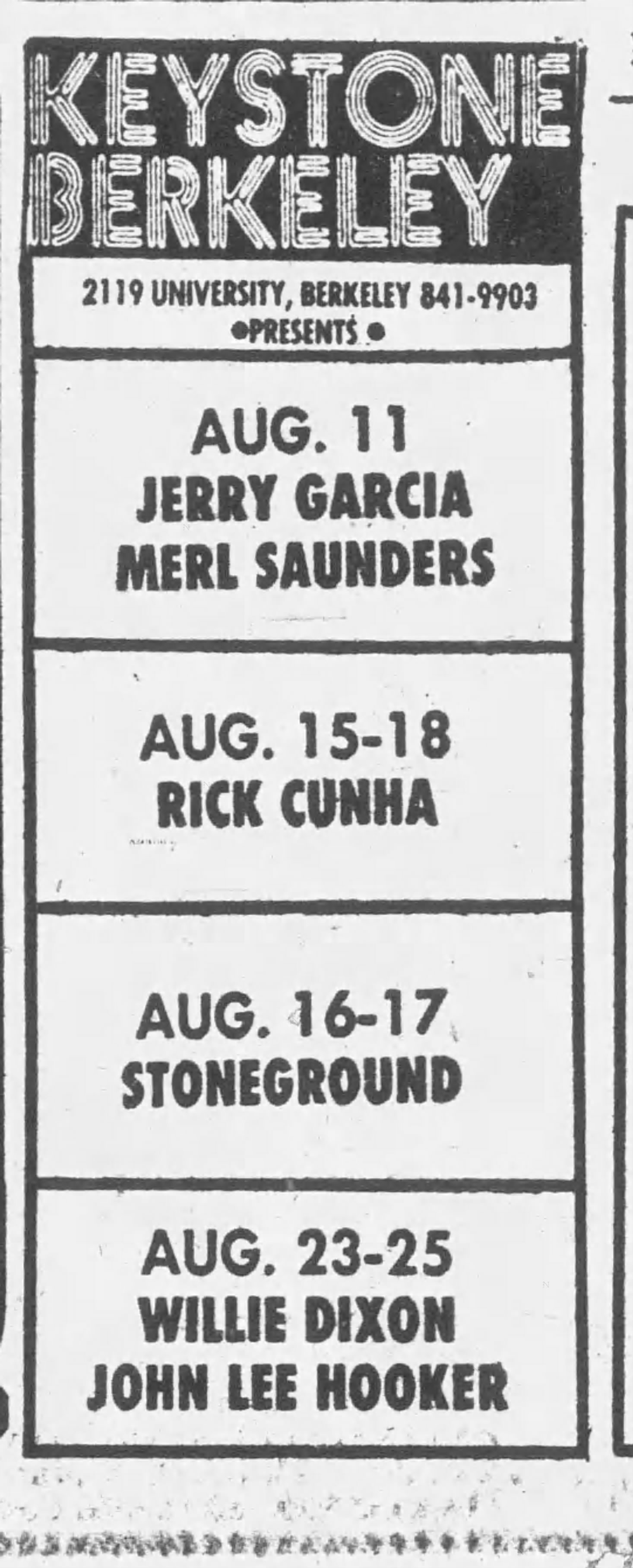 mentions: "Docker Hill Boys Set Stand at Lion's Share," Independent-Journal [San Rafael, CA], August 9, 1974, p. 20 [image of Merl Saunders, caption "Merle {sic} Saunders With Jerry Garcia"] | Staska and Mangrum 19740809: "Jerry Garcia & Merl Saunders with Paul Pena play [Keystone Berkeley] Aug. 10-11" | "Happenings for South County Teens," Hayward Daily Review, August 10, 1974, p. 5