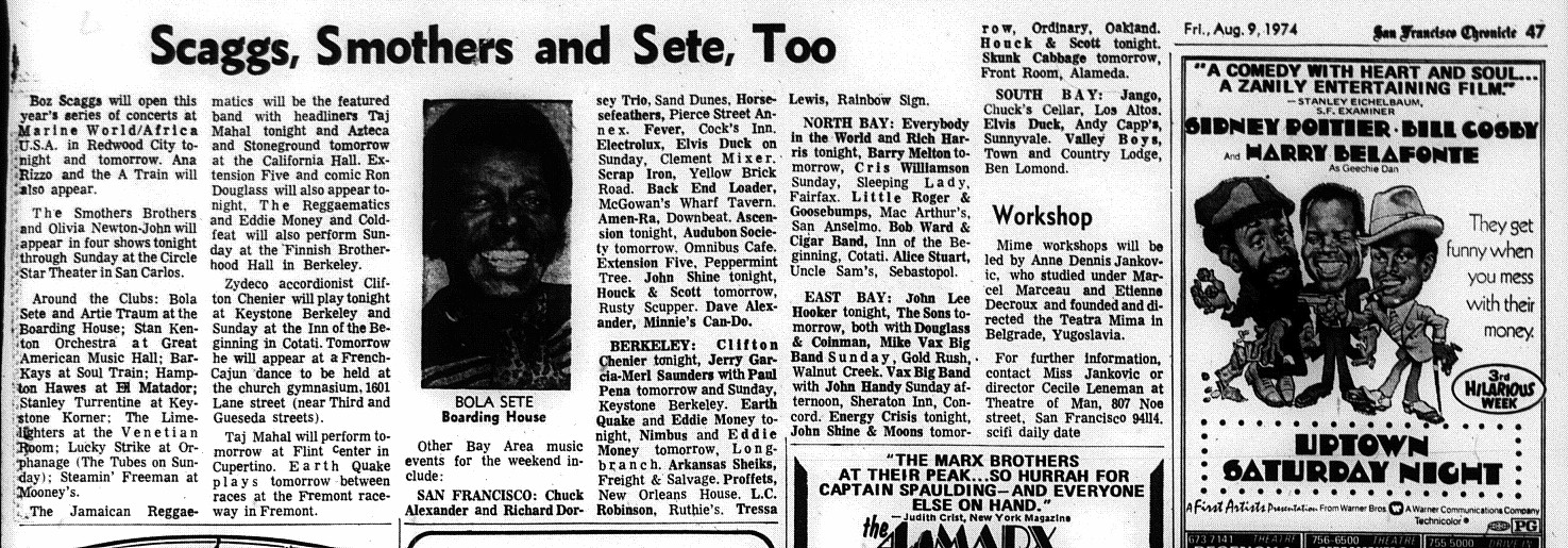 listings: Hayward Daily Review, August 9, 1974, p. 40 | "Scaggs, Smothers and Sete, Too," San Francisco Chronicle, August 9, 1974, p. 47