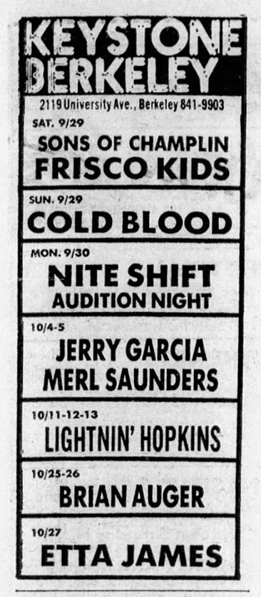 listings: San Francisco Sunday Examiner and Chronicle Datebook, September 29, 1974, p. 5 |Hayward Daily Review, October 4, 1974, p. 28
