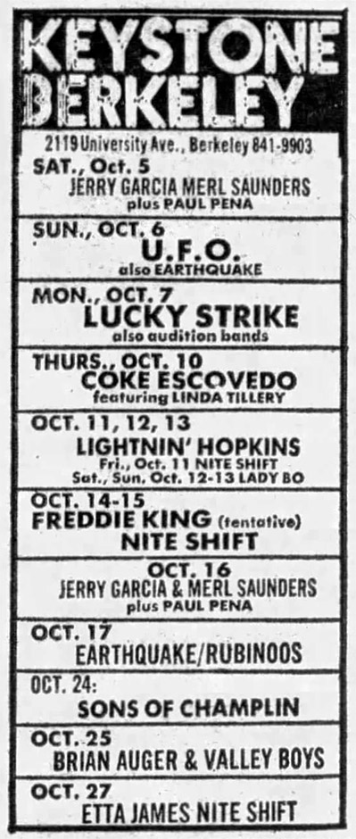listing: [contra] Hayward Daily Review, October 11, 1974, p. 32, billing "Monday and Tuesday, Oct. 14-15, Freddie King, Night Shift (tentative); Wednesday, Oct. 16, Jerry Garcia and Merl Saunders, Paul Pena." Of course GD played Winterland that night. | "Some Midweek Sounds," San Francisco Chronicle, October 14, 1974, p. 40