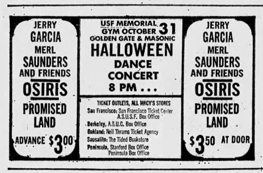 mention: Foghorn, October 18, 1974, p. 10: "KUSF will present Jerry Garcia and Merle [sic] Saunders in a Halloween Dance Concert", noting it is a benefit for the station (also noted at top of the handbill). Images of the pages from the Foghorn available here and here