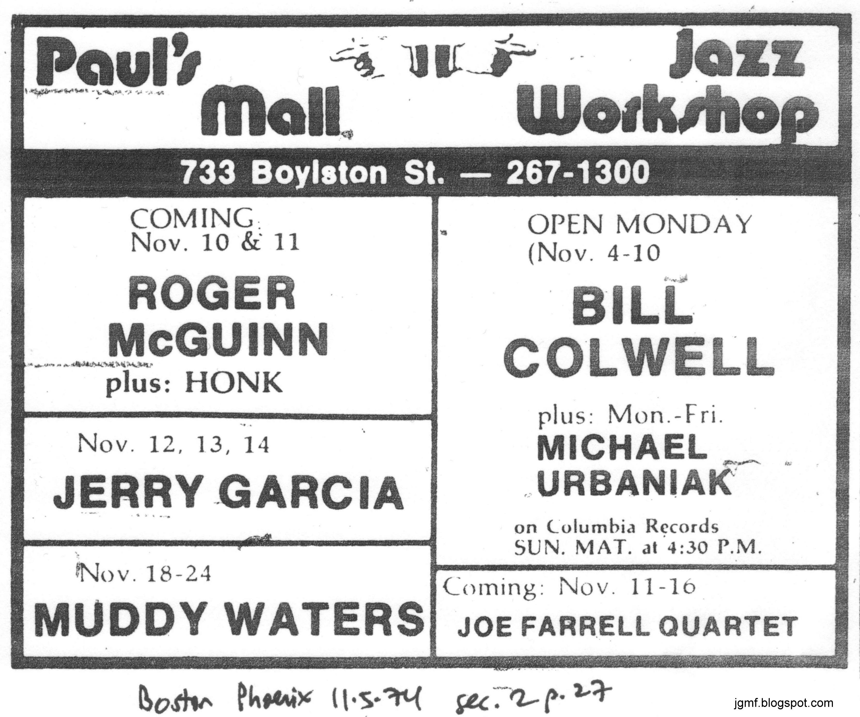 Sue: contract gives address as 739 Boylston Street. Ad in Boston Phoenix bills only as "Jerry Garcia" and doesn't mention early/late shows, but AFM contract shows early and late. For the six shows, JGMS get $5,000 guarantee plus 70% gross receipts over $8,100. Globe listing commits the contractual faux pas of mentioning Jerry's GD affiliation.