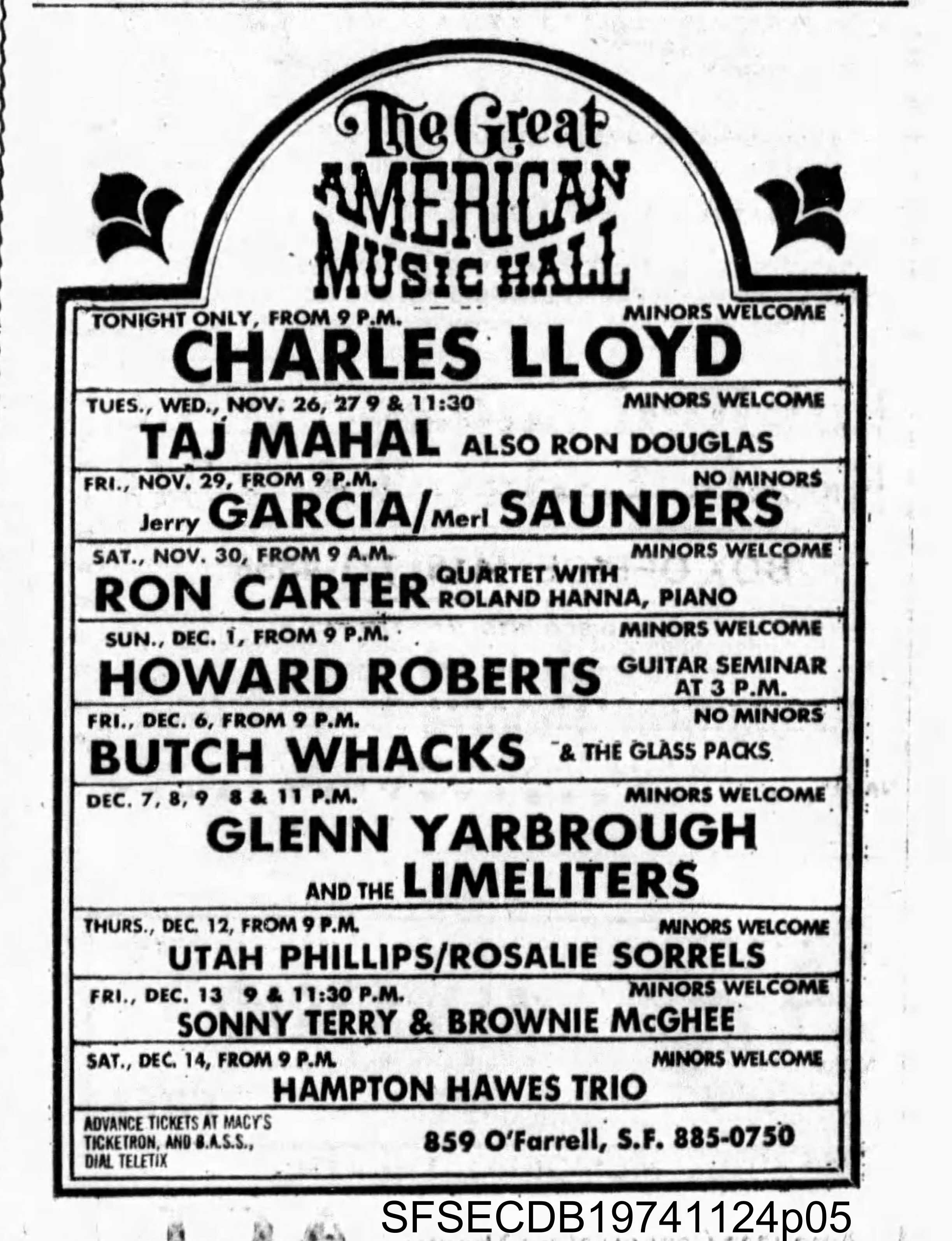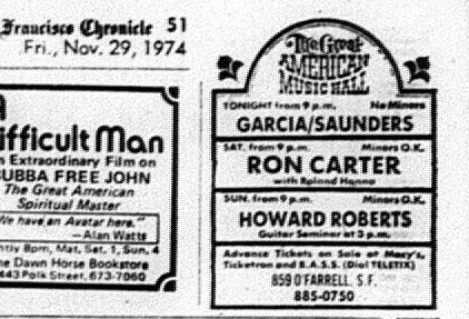 listings: Hayward Daily Review, November 22, 1974, p. 56 | "Rap Up's Wrap-Up," Oakland Tribune, November 24, 1974, p. 2-RAP | San Francisco Sunday Examiner and Chronicle Datebook, November 24, 1974, p. 4 | San Francisco Sunday Examiner and Chronicle Datebook, November 24, 1974, p. 7 | "'Sons of Champlin' In Hub City" [photo Garcia and Saunders, caption "Merle [sic] Saunders and Jerry Garcia perform tonight in San Francisco"], Independent-Journal [San Rafael, CA], November 29, 1974, p. 16 | "Datebook," San Francisco Chronicle, November 29, 1974, p. 50 | "The Bay Area's Sounds of Music," San Francisco Chronicle, November 29, 1974, p. 52 | San Francisco Examiner, November 29, 1974, p. 30